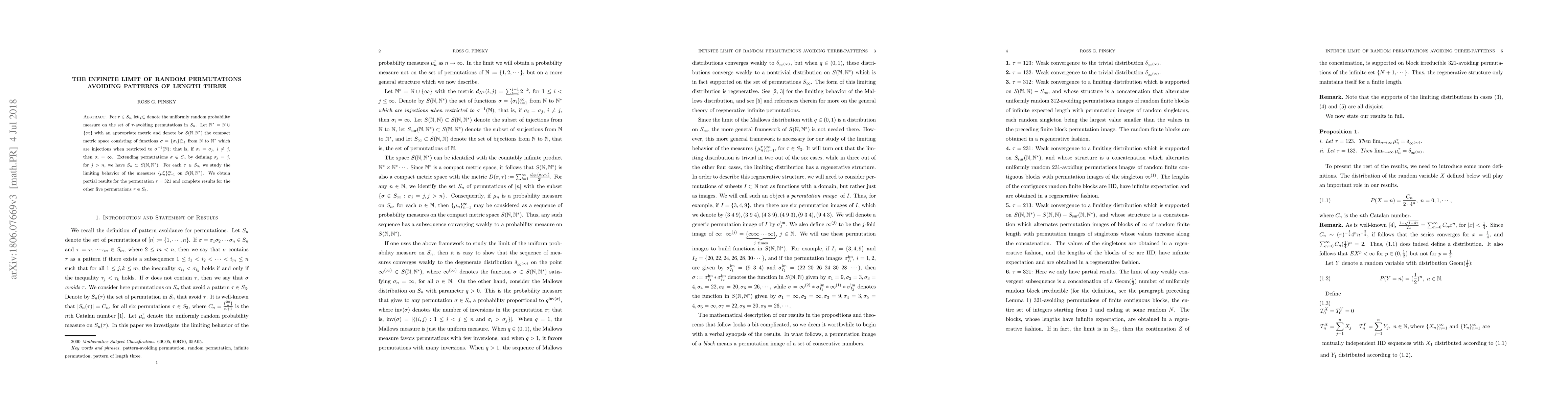 For $\tau\in S_3$, let $\mu_n^{\tau}$ denote the uniformly random probability measure on the set of $\tau$-avoiding permutations in $S_n$. Let $\mathbb{N}^*=\mathbb{N}\cup\{\infty\}$ with an appropriate metric and denote by $S(\mathbb{N},\mathbb{N}^*)$ the compact metric space consisting of functions $\sigma=\{\sigma_i\}_{ i=1}^\infty$ from $\mathbb{N}$ to $\mathbb{N}^*$ which are injections when restricted to $\sigma^{-1}(\mathbb{N})$\rm; that is, if $\sigma_i=\sigma_j$, $i\neq j$, then $\sigma_i=\infty$. Extending permutations $\sigma\in S_n$ by defining $\sigma_j=j$, for $j>n$, we have $S_n\subset S(\mathbb{N},\mathbb{N}^*)$. For each $\tau\in S_3$, we study the limiting behavior of the measures $\{\mu_n^{\tau}\}_{n=1}^\infty$ on $S(\mathbb{N},\mathbb{N}^*)$.