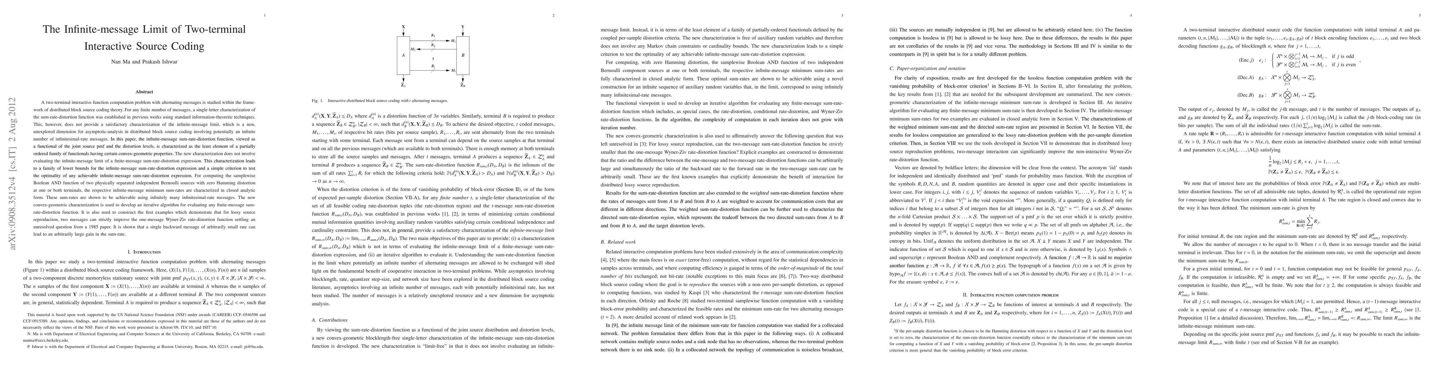 A two-terminal interactive function computation problem with alternating messages is studied within the framework of distributed block source coding theory. For any finite number of messages, a single-letter characterization of the sum-rate-distortion function was established in previous works using standard information-theoretic techniques. This, however, does not provide a satisfactory characterization of the infinite-message limit, which is a new, unexplored dimension for asymptotic-analysis in distributed block source coding involving potentially an infinite number of infinitesimal-rate messages. In this paper, the infinite-message sum-rate-distortion function, viewed as a functional of the joint source pmf and the distortion levels, is characterized as the least element of a partially ordered family of functionals having certain convex-geometric properties. The new characterization does not involve evaluating the infinite-message limit of a finite-message sum-rate-distortion expression. This characterization leads to a family of lower bounds for the infinite-message sum-rate-distortion expression and a simple criterion to test the optimality of any achievable infinite-message sum-rate-distortion expression. For computing the amplewise Boolean AND function, the infinite-message minimum sum-rates are characterized in closed analytic form. These sum-rates are shown to be achievable using infinitely many infinitesimal-rate messages. The new convex-geometric characterization is used to develop an iterative algorithm for evaluating any finite-message sumrate-distortion function. It is also used to construct the first examples which demonstrate that for lossy source reproduction, two messages can strictly improve the one-message Wyner-Ziv rate-distortion function settling an unresolved question from a 1985 paper.