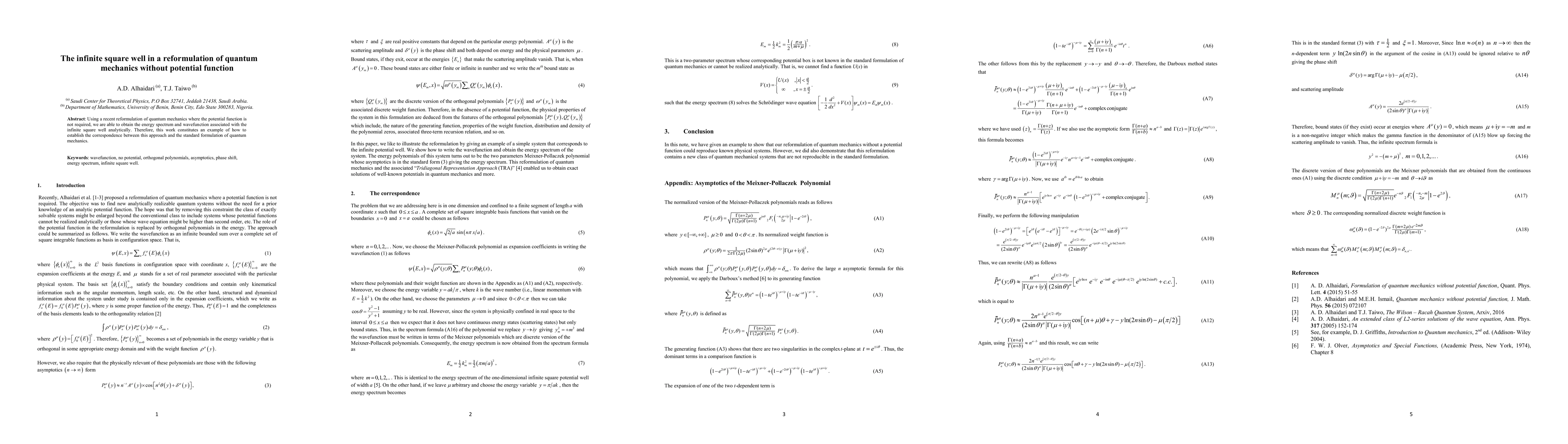 Summary: This paper reformulates quantum mechanics without a potential function and analytically derives the energy spectrum and wave function for the infinite square well, demonstrating the correspondence with standard quantum mechanics.