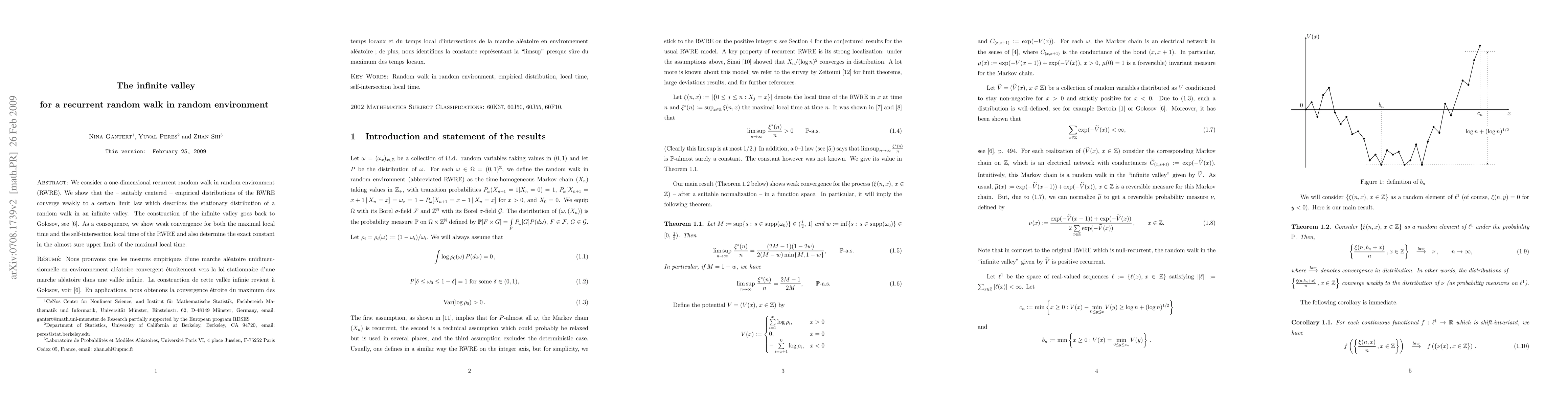 This paper studies a one-dimensional recurrent random walk in random environment, demonstrating that its empirical distributions converge to a limit law describing a random walk in an infinite valley. It also proves weak convergence for maximal and self-intersection local times and determines the exact constant in the almost sure upper limit of the maximal local time.