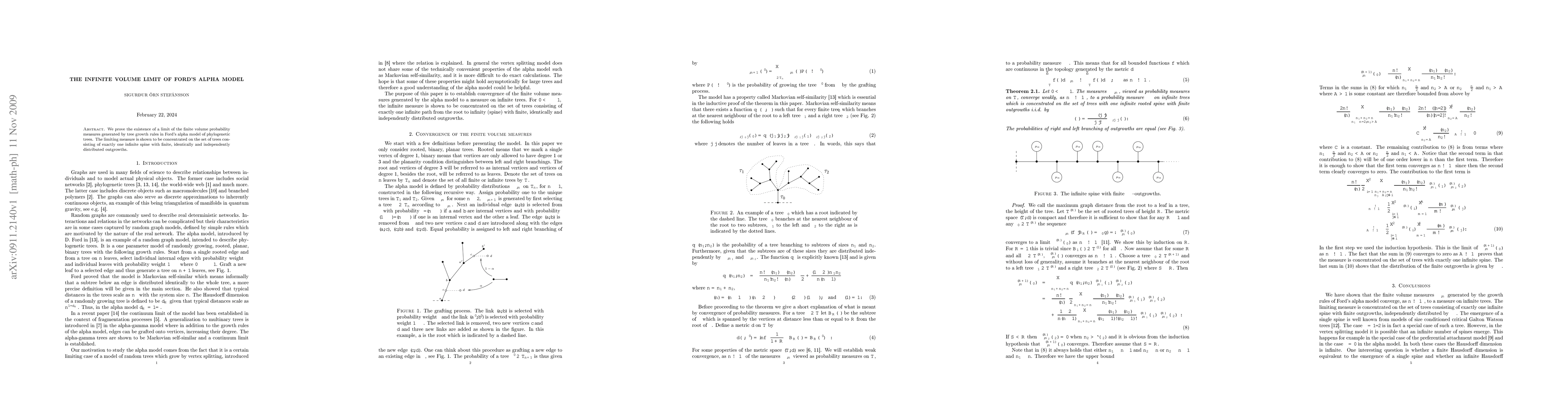 We prove the existence of a limit of the finite volume probability measures generated by tree growth rules in Ford's alpha model of phylogenetic trees. The limiting measure is shown to be concentrated on the set of trees consisting of exactly one infinite spine with finite, identically and independently distributed outgrowths.