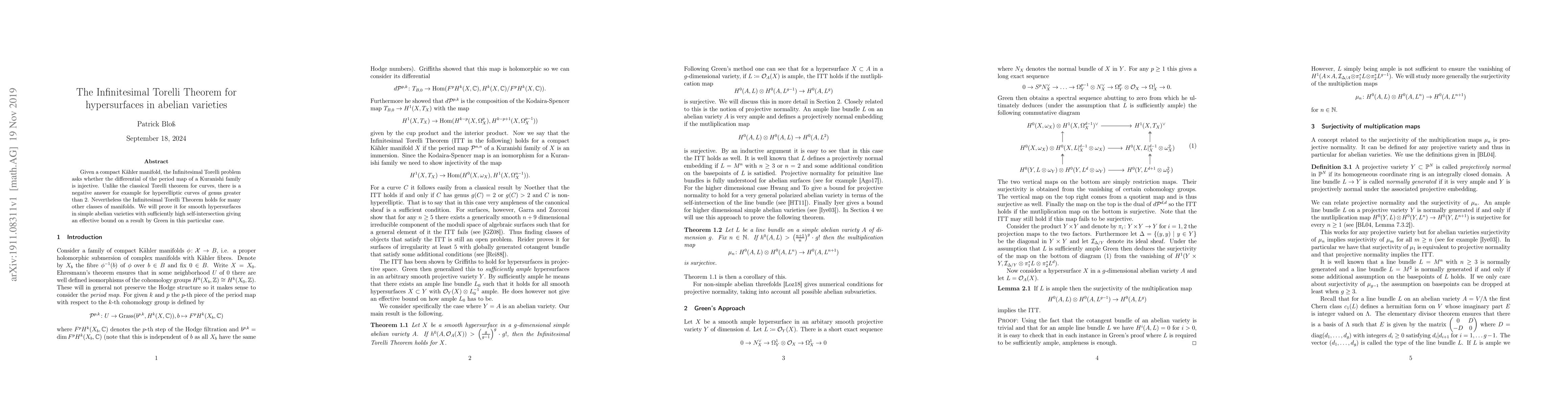 Given a compact K\"ahler manifold, the Infinitesimal Torelli problem asks whether the differential of the period map of a Kuranishi family is injective. Unlike the classical Torelli theorem for curves, there is a negative answer for example for hyperelliptic curves of genus greater than $2$. Nevertheless the Infinitesimal Torelli Theorem holds for many other classes of manifolds. We will prove it for smooth hypersurfaces in simple abelian varieties with sufficiently high self-intersection giving an effective bound on a result by Green in this particular case.