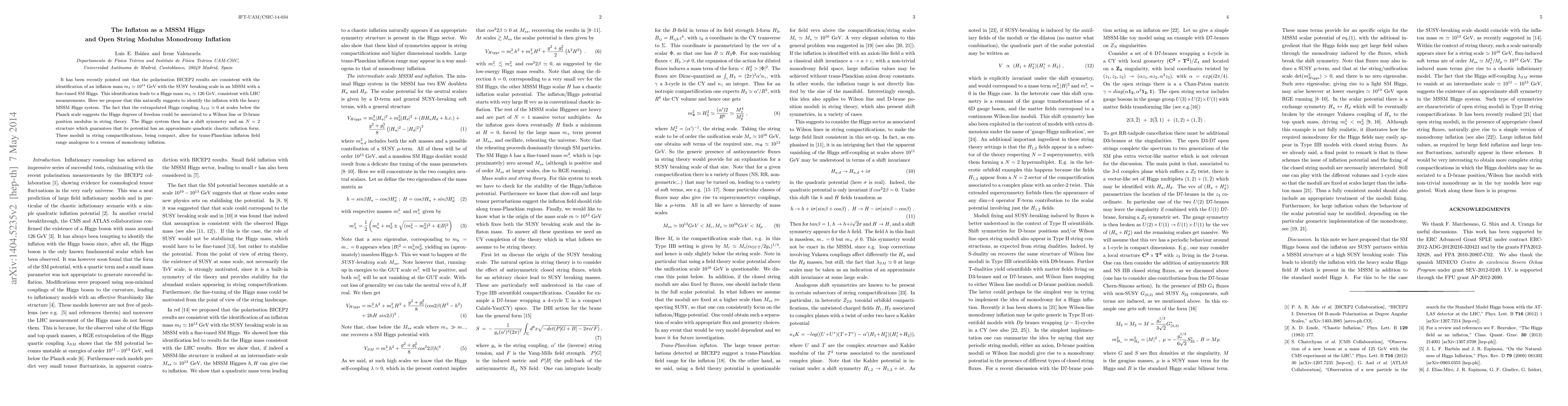 Researchers propose identifying the inflaton with a heavy MSSM Higgs system in string theory, suggesting a link between the Higgs and open string modulus monodromy inflation.