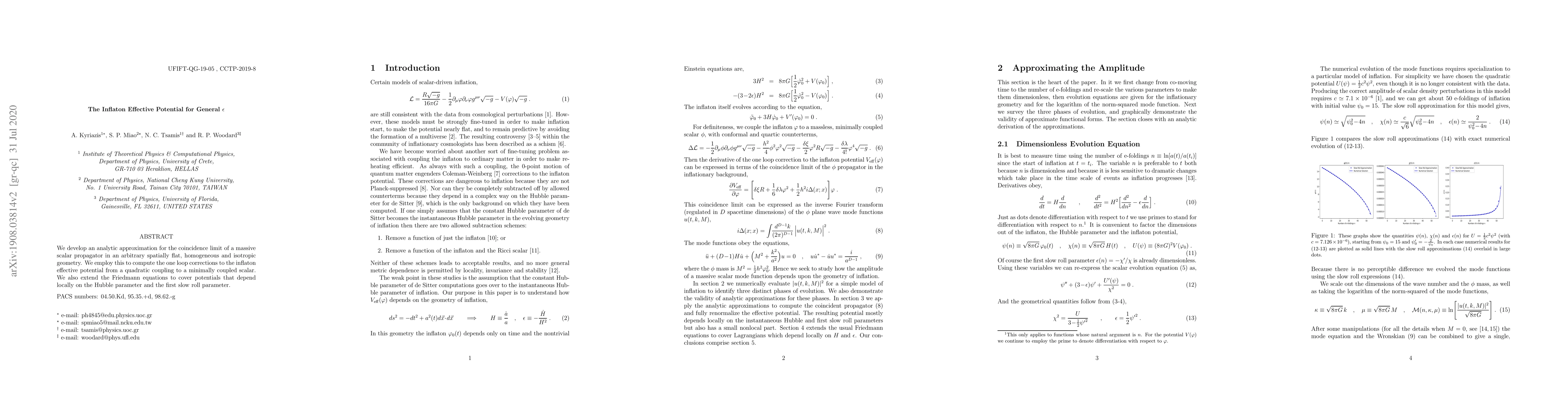 We develop an analytic approximation for the coincidence limit of a massive scalar propagator in an arbitrary spatially flat, homogeneous and isotropic geometry. We employ this to compute the one loop corrections to the inflaton effective potential from a quadratic coupling to a minimally coupled scalar. We also extend the Friedmann equations to cover potentials that depend locally on the Hubble parameter and the first slow roll parameter.