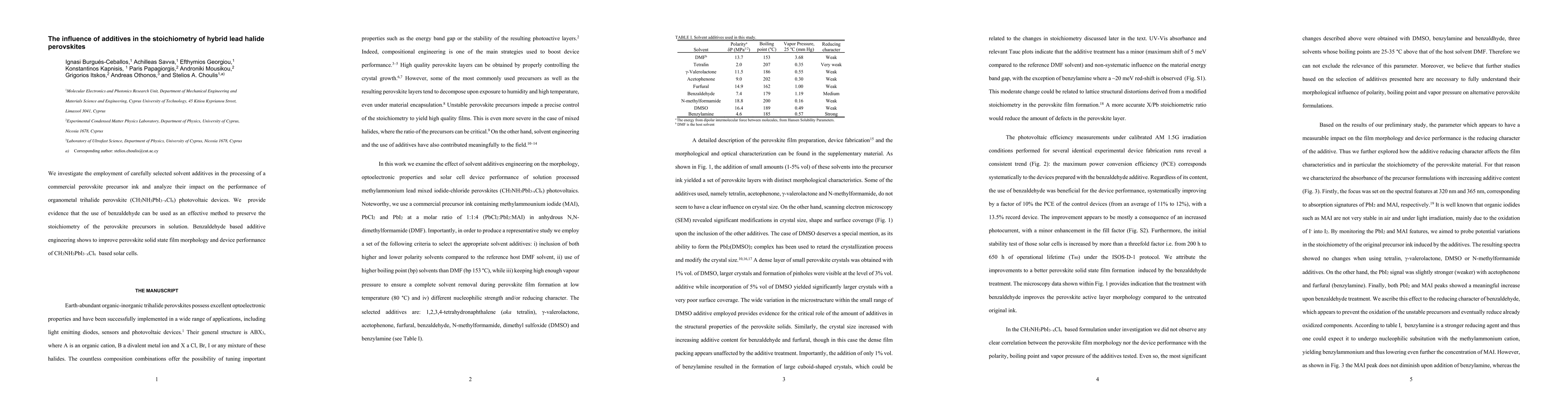 The research explores the use of benzaldehyde as an additive in processing perovskite precursor inks, demonstrating its effectiveness in maintaining perovskite precursor stoichiometry in solution. This additive engineering enhances perovskite film morphology and improves the performance of solar cells based on trihalide perovskites.