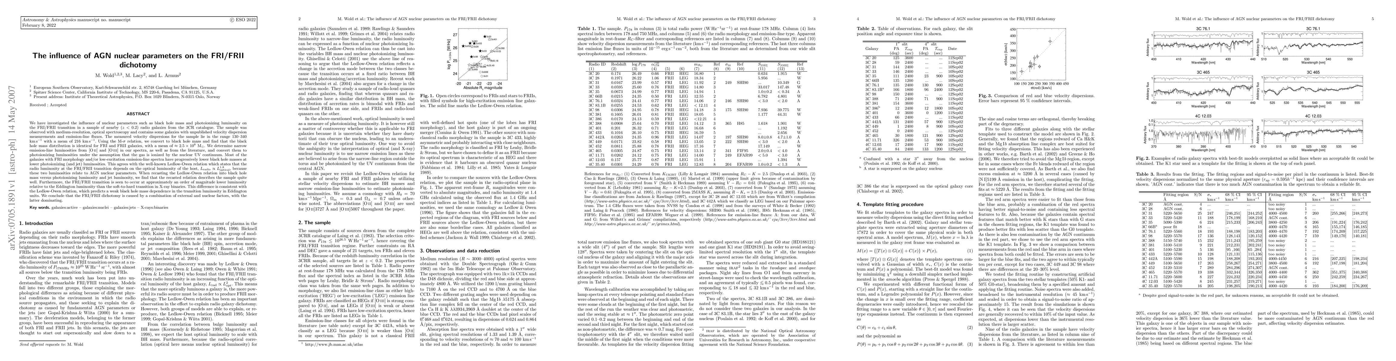 We have investigated the influence of nuclear parameters such as black hole (BH) mass and photoionizing luminosity on the FRI/FRII transition in a sample of nearby (z<0.2) 3CR radio galaxies. The sample was observed with medium-resolution, optical spectroscopy and contains some galaxies with unpublished velocity dispersion measurements and emission-line fluxes. Measured velocity dispersions are 130-340 km/s with a mean of 216 km/s. Converting to BH mass, we find that the BH mass distribution is identical for FRIs and FRIIs, with a mean of approximately 2.5x10^8 Msun. We convert [OII] and [OIII] emission-line luminosities to photoionizing luminosity under the assumption that the gas is ionized by the nuclear UV continuum. Most of the galaxies with FRI morphology and/or low-excitation emission-line spectra have progressively lower BH masses at lower photoionizing (and jet) luminosities. This agrees with the Ledlow-Owen relation which states that the radio luminosity at the FRI/FRII transition depends on the optical luminosity of the host, L_radio ~ L_optical^1.8, because both L_radio and L_optical relate to AGN nuclear parameters. When recasting the Ledlow-Owen relation into BH mass versus photoionizing and jet luminosity, we find that the recasted relation describes the sample quite well. The FRI/FRII transition occurs at approximately an order of magnitude lower luminosity relative to the Eddington luminosity than the soft-to-hard transition in X-ray binaries. This difference is consistent with the Ledlow-Owen relation, which predicts a weak BH mass dependence in the transition luminosity. We conclude that the FRI/FRII dichotomy is caused by a combination of external and nuclear factors, with the latter dominating.