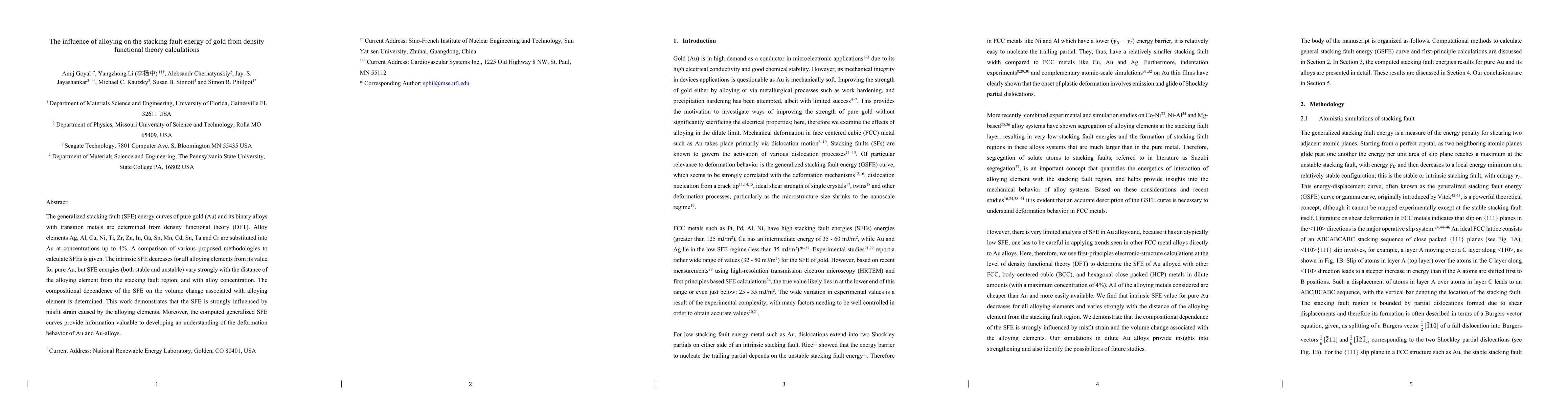 This study uses density functional theory to calculate the generalized stacking fault energy (SFE) of gold and its binary alloys with various transition metals. The results show that alloying generally decreases the SFE, with significant variations depending on the alloying element's proximity to the fault and concentration, highlighting the influence of misfit strain on SFE.
