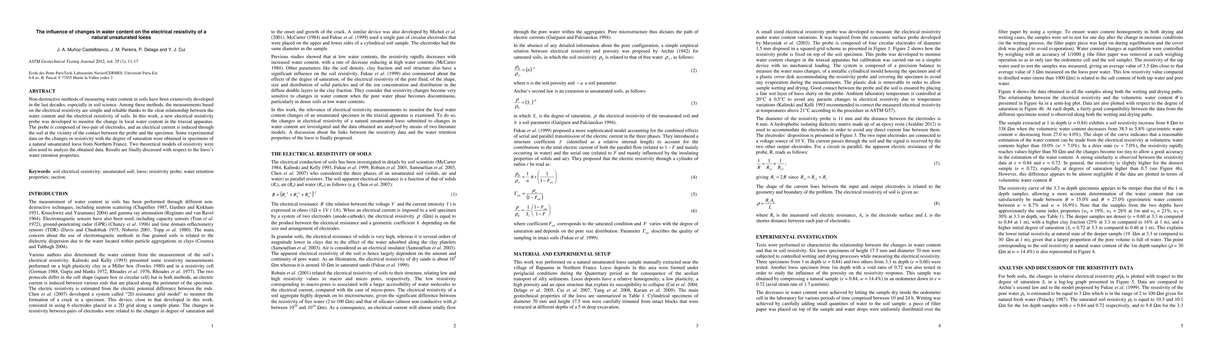 This study develops a new electrical resistivity probe to monitor water content changes in natural unsaturated loess, revealing a clear relationship between water content and electrical resistivity. Experimental data and theoretical models were used to analyze resistivity changes in loess specimens, providing insights into the material's water retention properties.