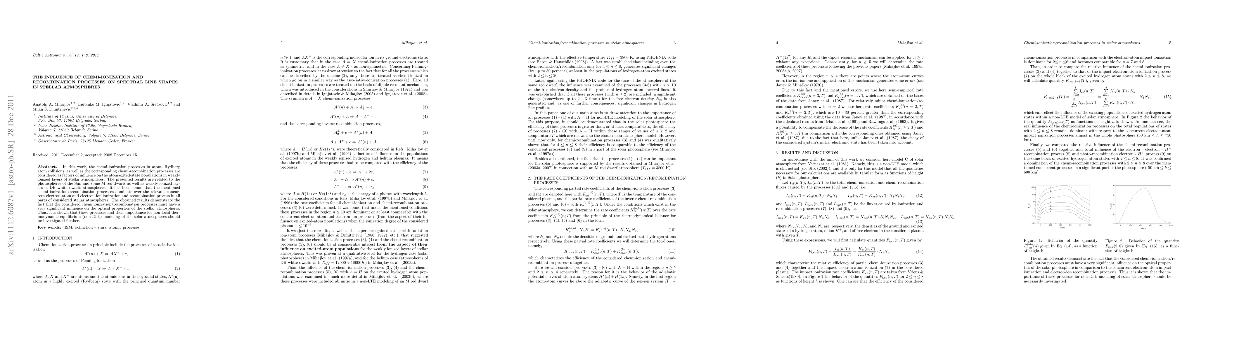 This paper investigates the impact of chemi-ionization and chemi-recombination processes in atom-Rydberg atom collisions on spectral line shapes in stellar atmospheres, finding that these processes dominate over electron-based ionization and recombination in the photospheres of the Sun and M red dwarfs, as well as in the weakly ionized layers of DB white dwarfs. The study emphasizes the significant influence of these processes on the optical properties and the need for further non-local thermodynamic equilibrium modeling.