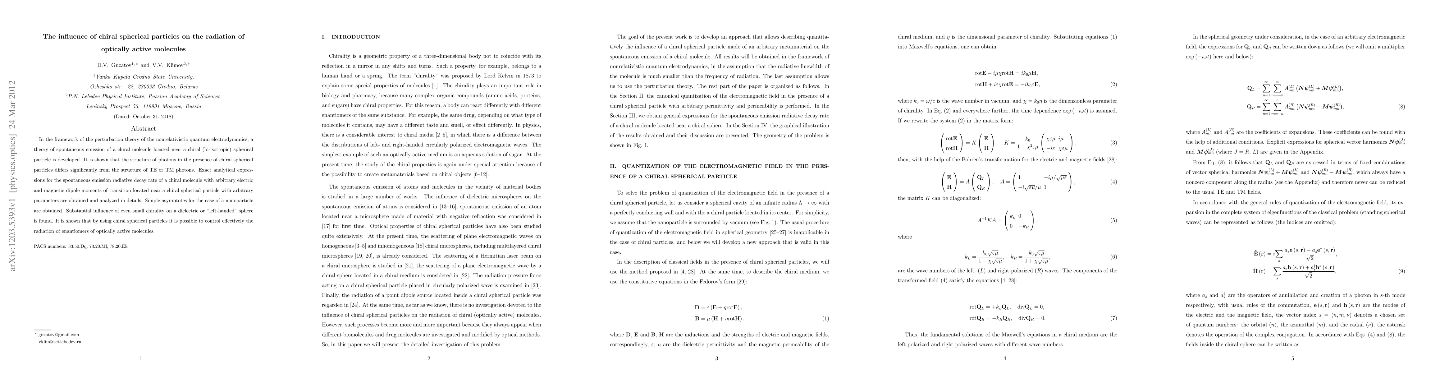 This paper develops a theory for the influence of chiral spherical particles on the spontaneous emission of optically active molecules, showing significant differences in photon structure and providing analytical expressions for radiative decay rates. It demonstrates the effective control of enantiomer radiation using chiral dielectric particles.