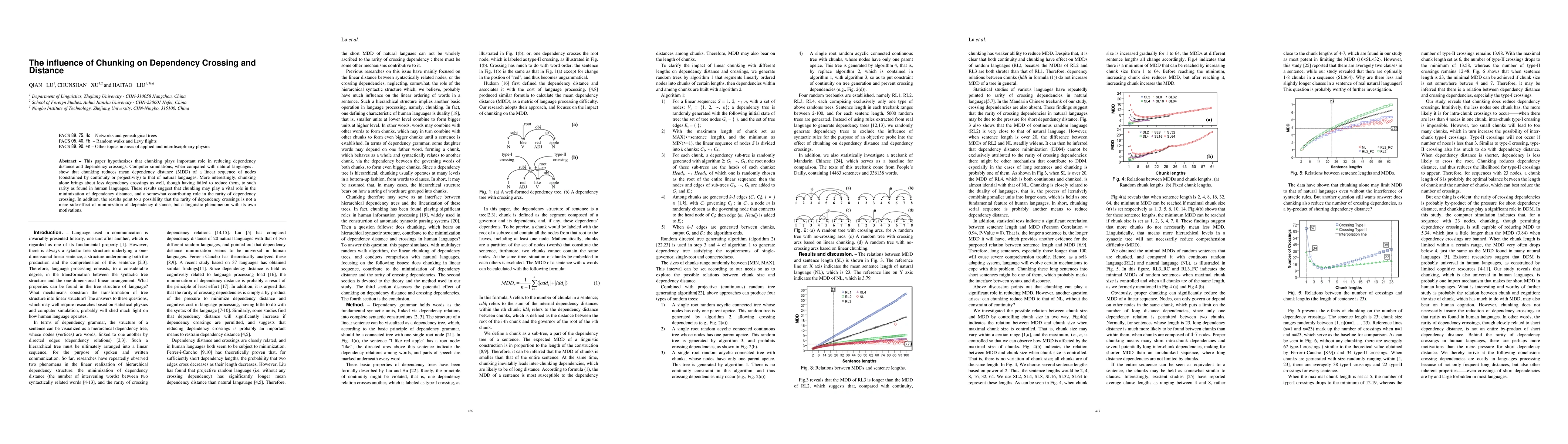 This paper finds that chunking significantly reduces mean dependency distance and somewhat decreases dependency crossings in simulated languages, suggesting chunking's role in minimizing dependency distance and hinting that the rarity of dependency crossings may have independent linguistic motivations.