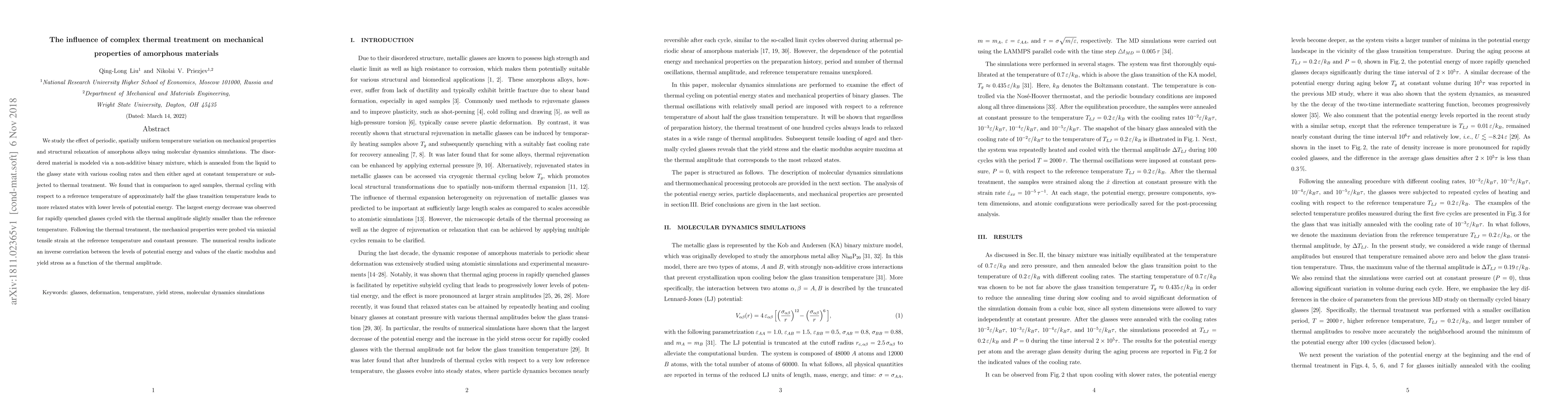 This study uses molecular dynamics simulations to investigate the impact of periodic thermal cycling on the mechanical properties of amorphous alloys. Results show that thermal treatment, especially with amplitudes near half the glass transition temperature, leads to lower potential energy and improved mechanical properties compared to aged samples.
