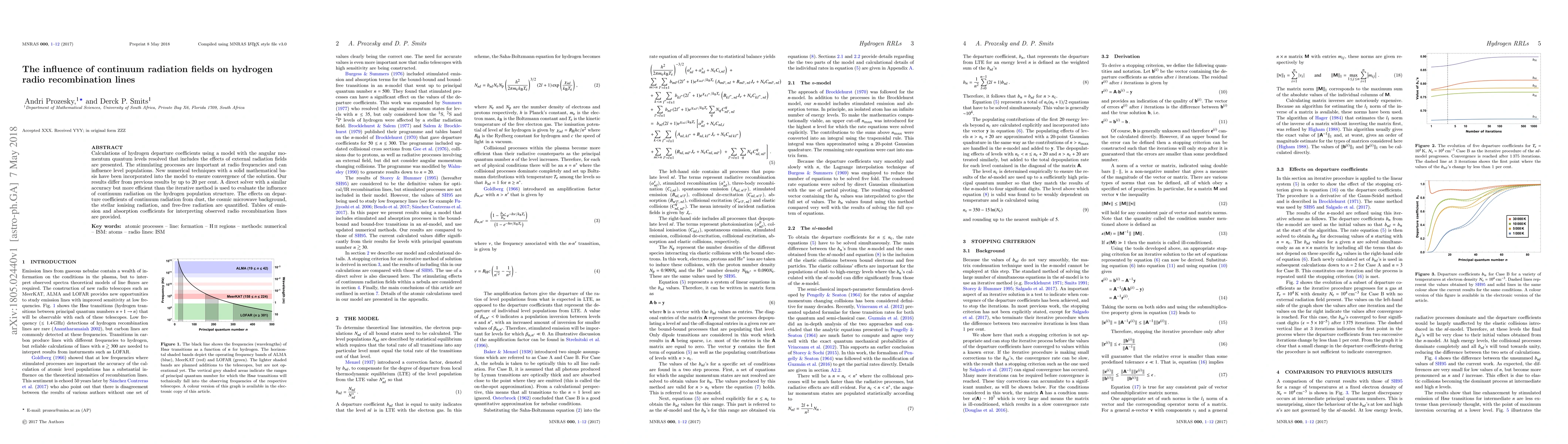 This paper presents new calculations of hydrogen departure coefficients considering the influence of continuum radiation fields, employing advanced numerical techniques. The study quantifies the effects of various radiation sources on hydrogen level populations and provides tables for interpreting radio recombination lines, differing from previous results by up to 20 percent.