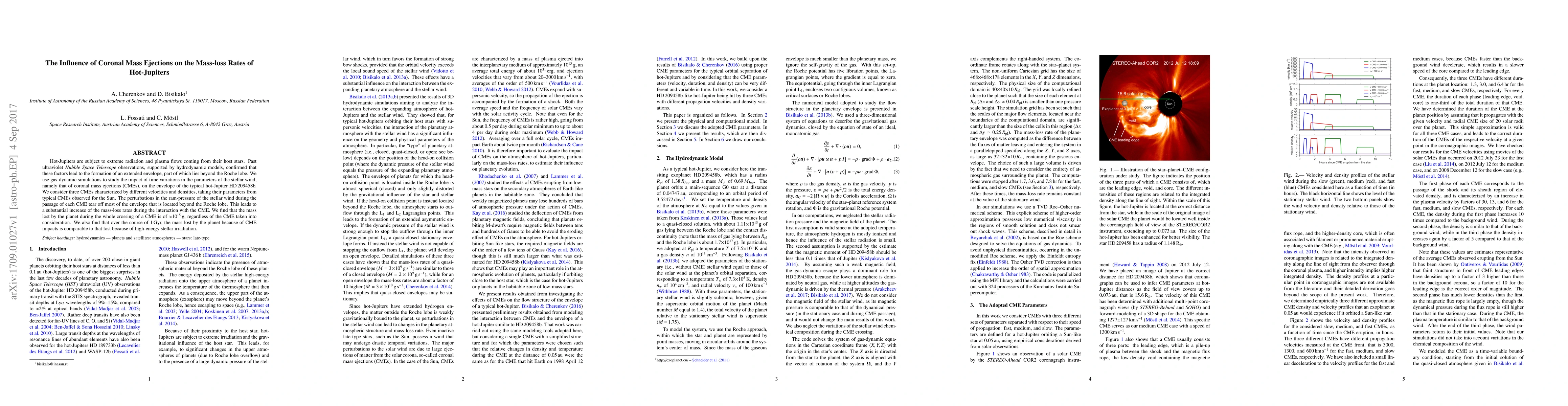 This study investigates how coronal mass ejections (CMEs) from a host star affect the mass-loss rates of the hot-Jupiter HD 209458b. Simulations reveal that CMEs significantly increase the mass-loss rate by stripping away the planet's extended envelope, leading to a loss of approximately $10^{15}$ g per CME event.