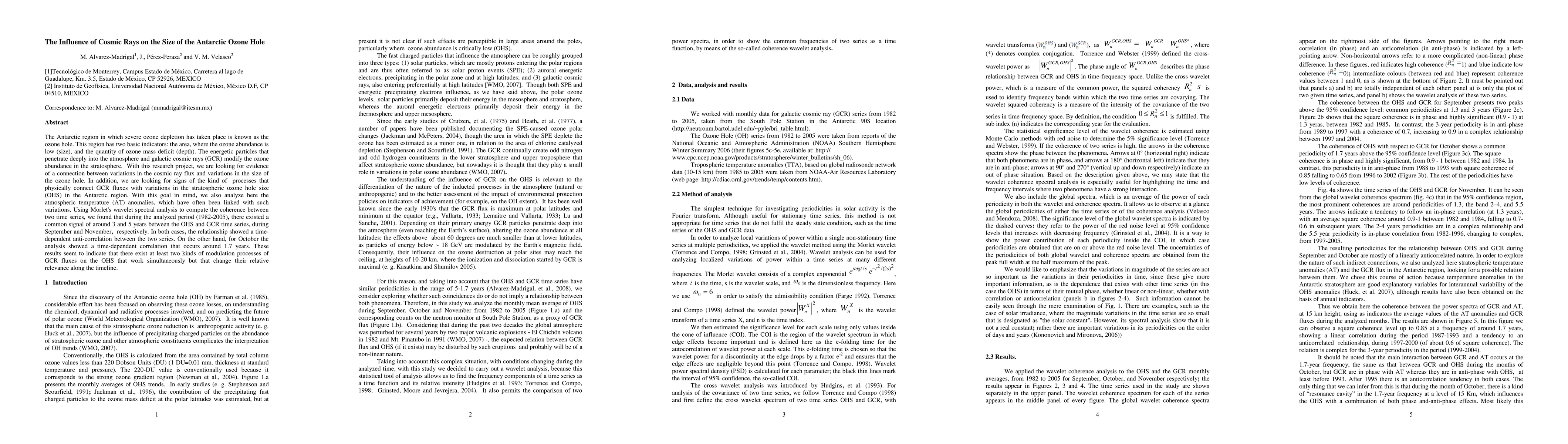 A study found that cosmic rays influence the size of the Antarctic Ozone Hole, with a common signal of around 3 and 5 years between GCR fluxes and ozone hole size variations.