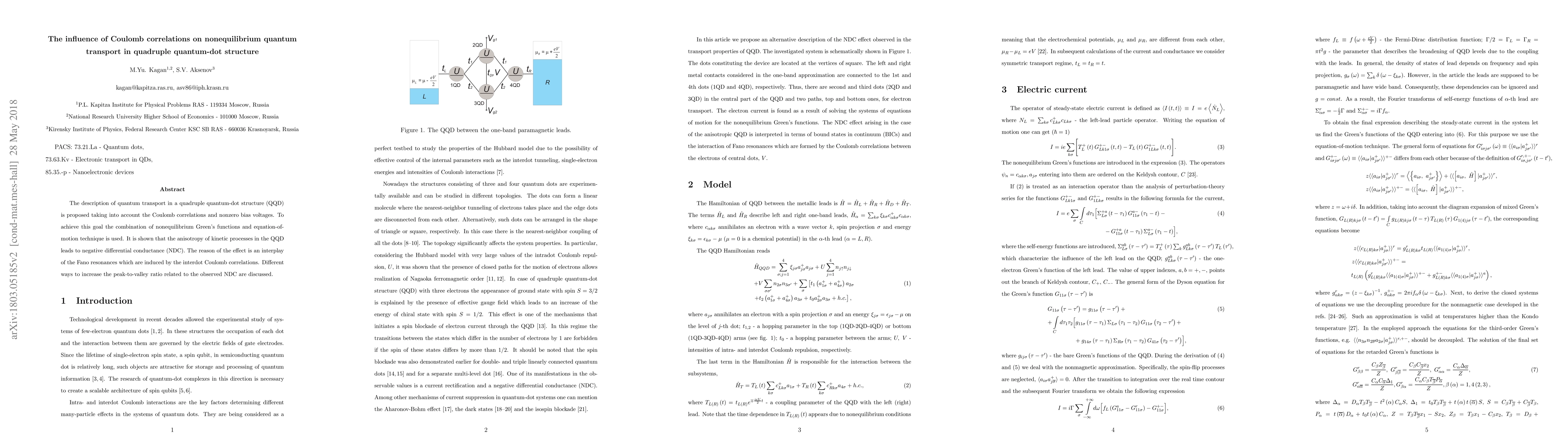 The description of quantum transport in a quadruple quantum-dot structure (QQD) is proposed taking into account the Coulomb correlations and nonzero bias voltages. To achieve this goal the combination of nonequilibrium Green's functions and equation-of-motion technique is used. It is shown that the anisotropy of kinetic processes in the QQD leads to negative differential conductance (NDC). The reason of the effect is an interplay of the Fano resonances which are induced by the interdot Coulomb correlations. Different ways to increase the peak-to-valley ratio related to the observed NDC are discussed.