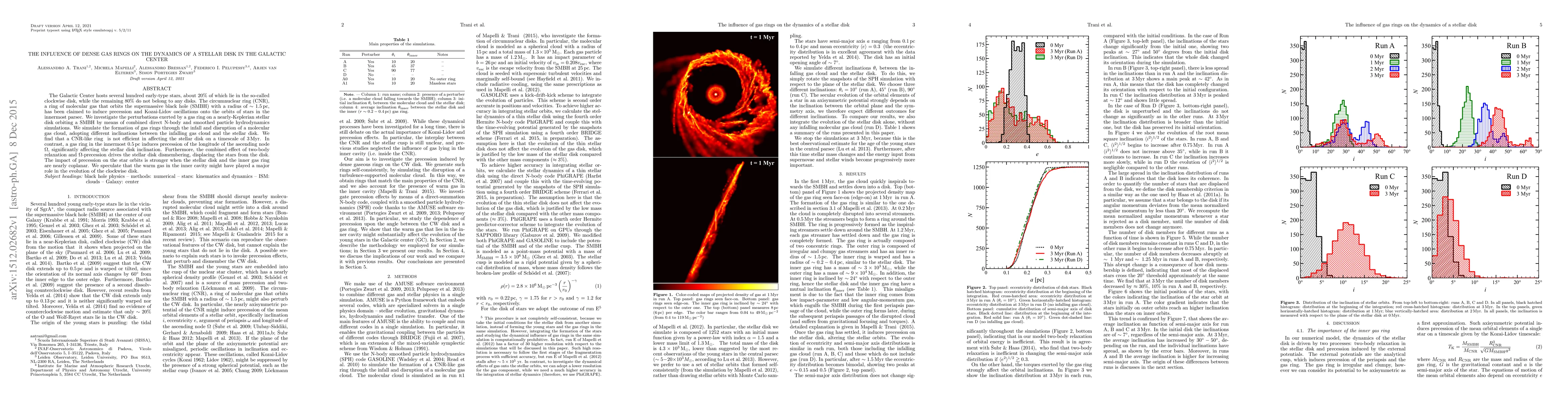 A study using simulations found that a dense gas ring in the Galactic center can induce precession and affect the dynamics of a stellar disk, potentially influencing the evolution of the clockwise disk.
