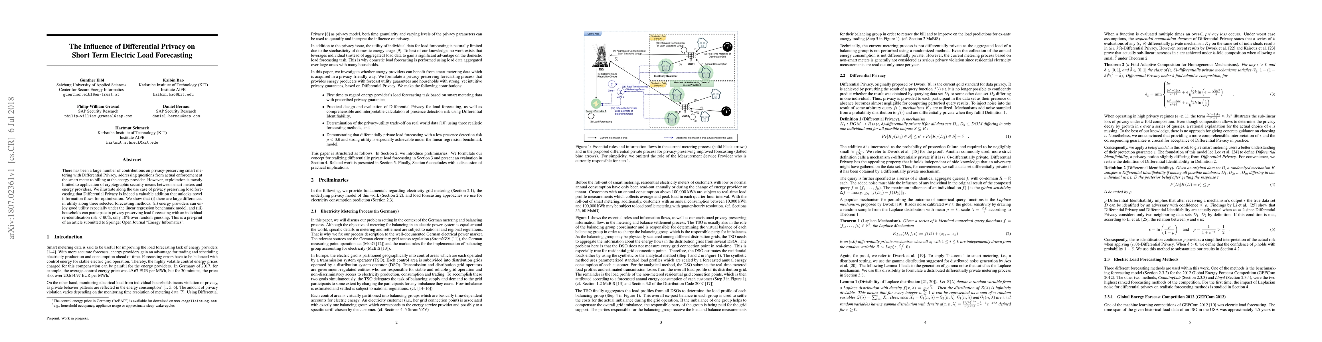 This paper explores the impact of Differential Privacy on short-term electric load forecasting, demonstrating its utility in optimizing privacy-preserving smart metering. It finds significant differences in utility among forecasting methods, with energy providers benefiting particularly under linear regression, while households can participate with minimal individual re-identification risk.