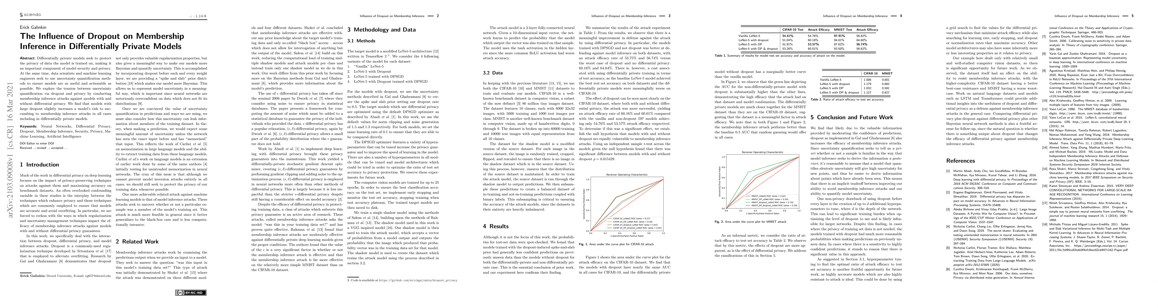 Differentially private models seek to protect the privacy of data the model is trained on, making it an important component of model security and privacy. At the same time, data scientists and machine learning engineers seek to use uncertainty quantification methods to ensure models are as useful and actionable as possible. We explore the tension between uncertainty quantification via dropout and privacy by conducting membership inference attacks against models with and without differential privacy. We find that models with large dropout slightly increases a model's risk to succumbing to membership inference attacks in all cases including in differentially private models.