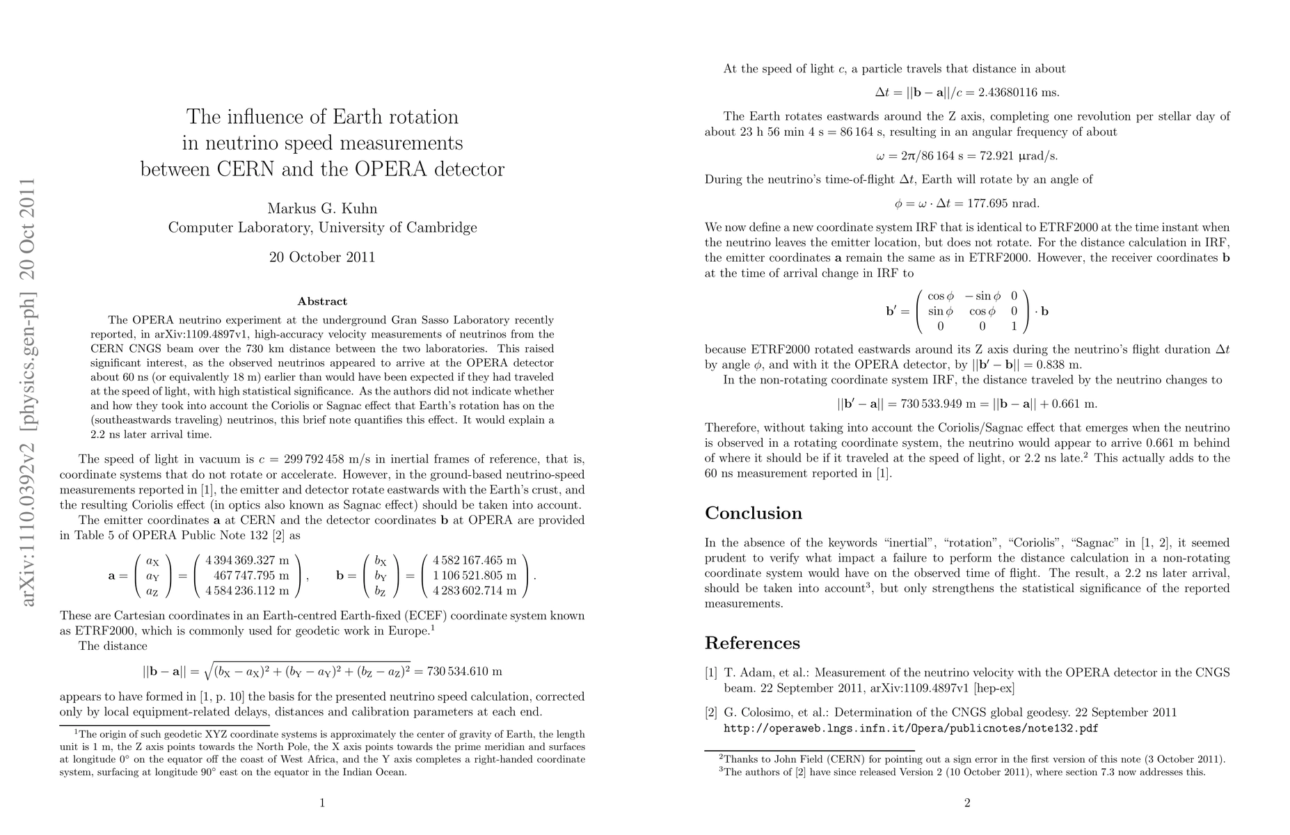 The research quantifies the Coriolis and Sagnac effects due to Earth's rotation on neutrinos traveling from CERN to the OPERA detector, using Cartesian coordinates in the ETRF2000 (ETRF2000) geodetic system.
