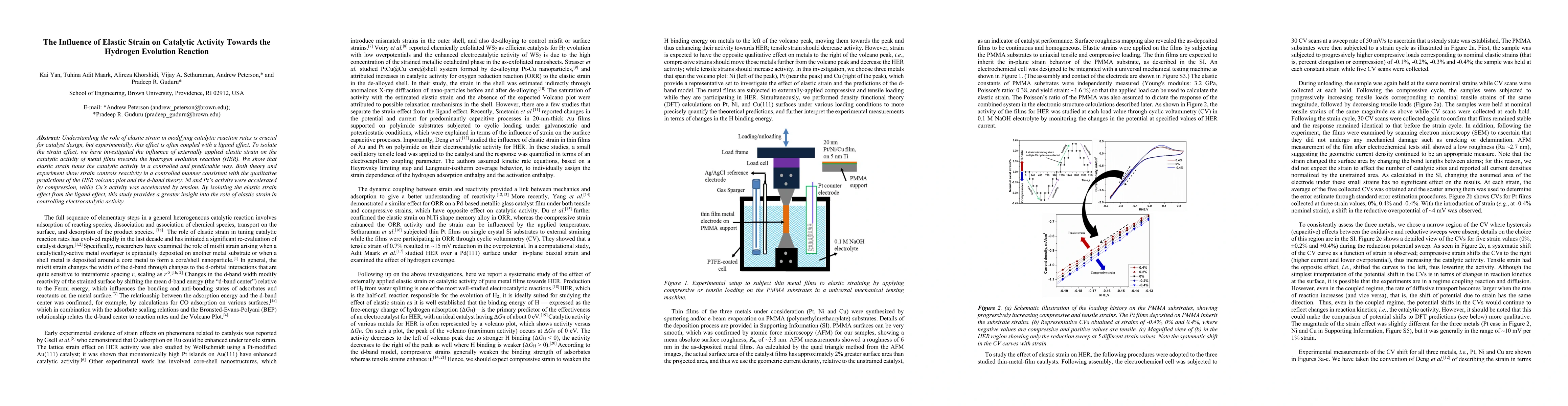 This study investigates how externally applied elastic strain influences the catalytic activity of metal films in the hydrogen evolution reaction (HER). Results show that elastic strain predictably tunes catalytic activity, with compression enhancing Ni and Pt activity and tension enhancing Cu activity, providing deeper insights into the role of elastic strain in electrocatalysis.