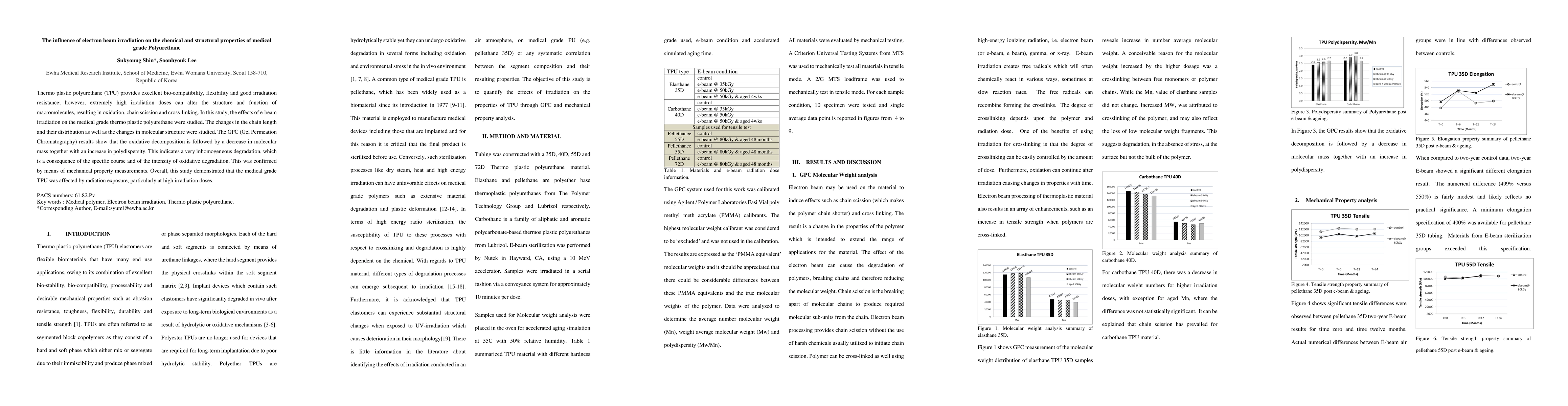 This study investigates the impact of electron beam irradiation on medical grade thermoplastic polyurethane (TPU), revealing that high doses lead to oxidative decomposition, chain scission, and cross-linking, resulting in decreased molecular mass and increased polydispersity. Mechanical property measurements confirm the inhomogeneous degradation caused by the specific irradiation intensity.