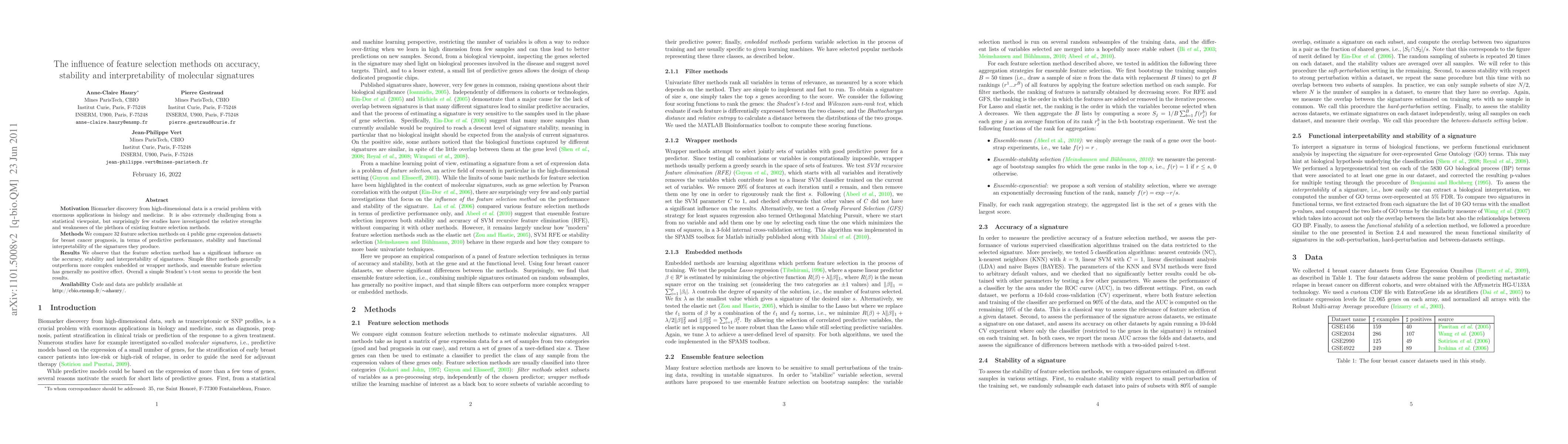 A study compared 32 feature selection methods on gene expression datasets for breast cancer prognosis, finding that simple filter methods outperform complex methods, with a Student's t-test providing the best results.