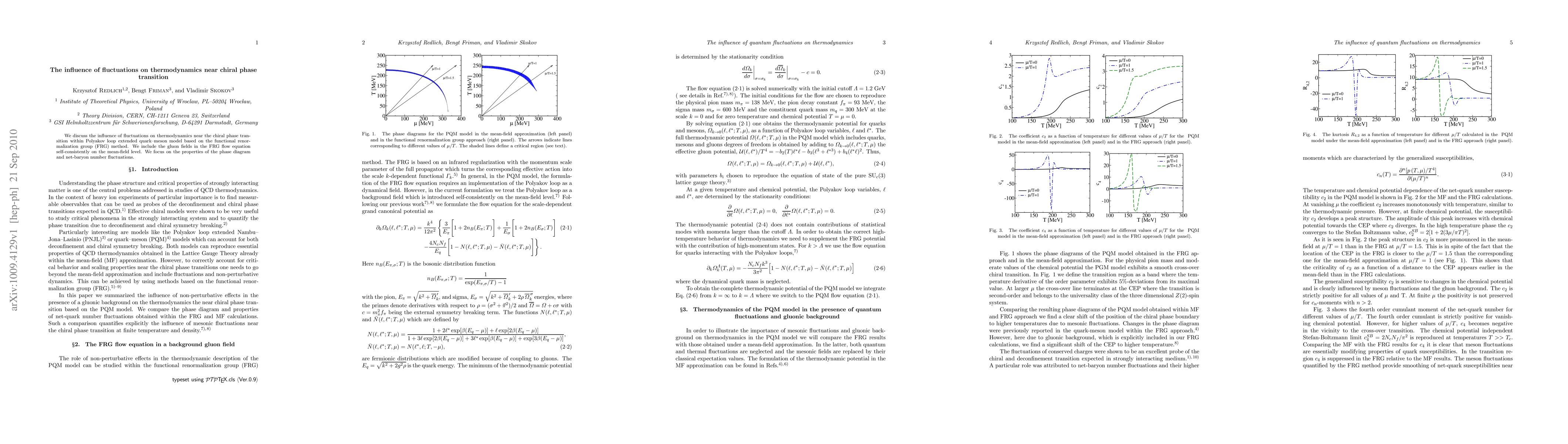 We discuss the influence of fluctuations on thermodynamics near the chiral phase transition within Polyakov loop extended quark--meson model based on the functional renormalization group (FRG) method. We include the gluon fields in the FRG flow equation self-consistently on the mean-field level. We focus on the properties of the phase diagram and net-baryon number fluctuations.