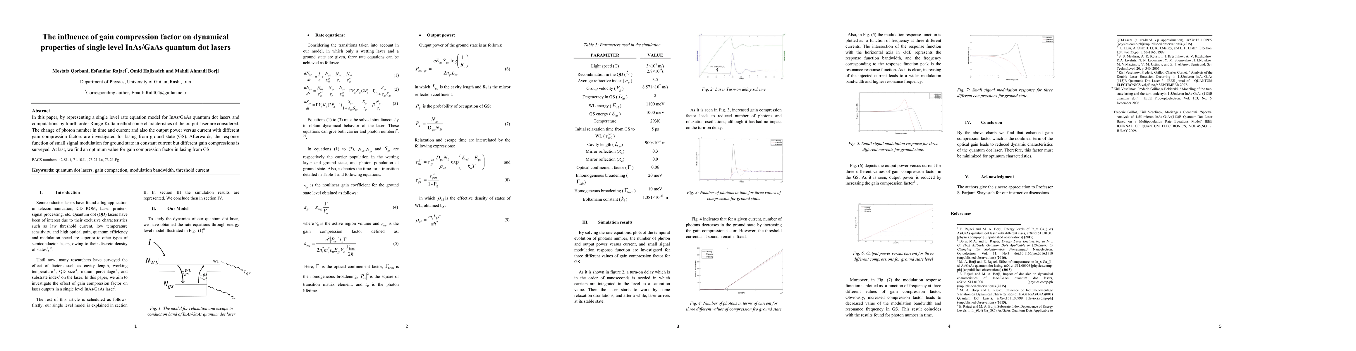 In this paper, by representing a single level rate equation model for InAs/GaAs quantum dot lasers and computations by fourth order Runge-Kutta method some characteristics of the output laser are considered. The change of photon number in time and current and also the output power versus current with different gain compression factors are investigated for lasing from ground state (GS). Afterwards, the response function of small signal modulation for ground state in constant current but different gain compressions is surveyed. At last, we find an optimum value for gain compression factor in lasing from GS.