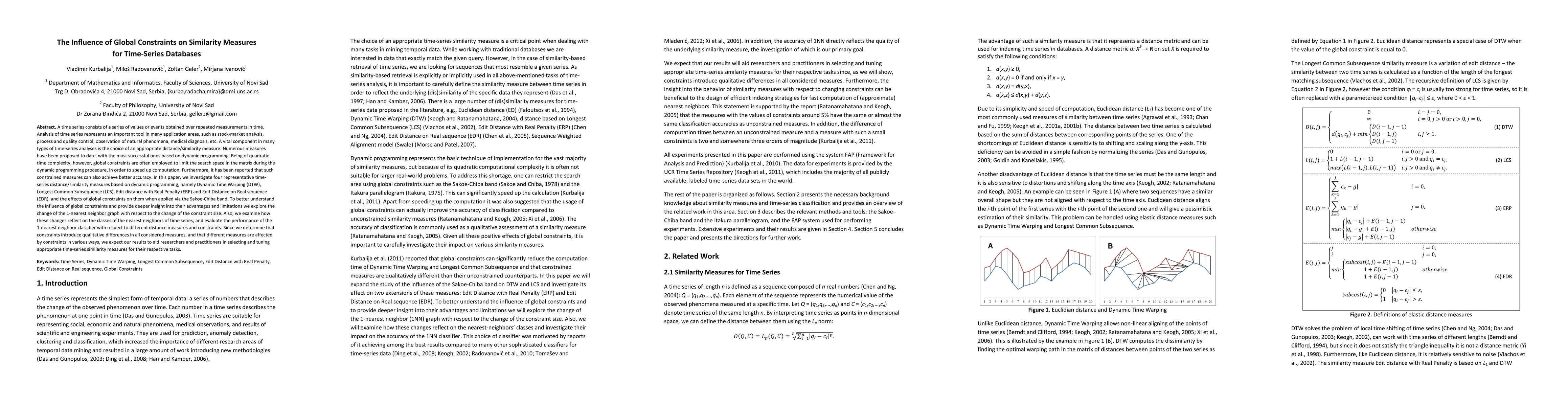 A time series consists of a series of values or events obtained over repeated measurements in time. Analysis of time series represents and important tool in many application areas, such as stock market analysis, process and quality control, observation of natural phenomena, medical treatments, etc. A vital component in many types of time-series analysis is the choice of an appropriate distance/similarity measure. Numerous measures have been proposed to date, with the most successful ones based on dynamic programming. Being of quadratic time complexity, however, global constraints are often employed to limit the search space in the matrix during the dynamic programming procedure, in order to speed up computation. Furthermore, it has been reported that such constrained measures can also achieve better accuracy. In this paper, we investigate two representative time-series distance/similarity measures based on dynamic programming, Dynamic Time Warping (DTW) and Longest Common Subsequence (LCS), and the effects of global constraints on them. Through extensive experiments on a large number of time-series data sets, we demonstrate how global constrains can significantly reduce the computation time of DTW and LCS. We also show that, if the constraint parameter is tight enough (less than 10-15% of time-series length), the constrained measure becomes significantly different from its unconstrained counterpart, in the sense of producing qualitatively different 1-nearest neighbor graphs. This observation explains the potential for accuracy gains when using constrained measures, highlighting the need for careful tuning of constraint parameters in order to achieve a good trade-off between speed and accuracy.