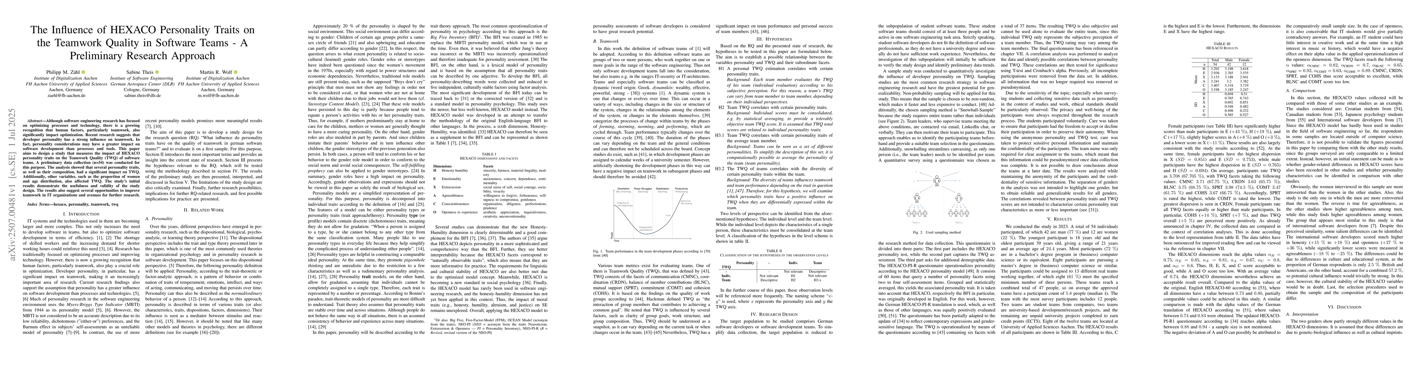 Although software engineering research has focused on optimizing processes and technology, there is a growing recognition that human factors, particularly teamwork, also significantly impact optimization. Recent research suggests that developer personality has a strong influence on teamwork. In fact, personality considerations may have a greater impact on software development than processes and tools. This paper aims to design a study that measures the impact of HEXACO personality traits on the Teamwork Quality (TWQ) of software teams. A preliminary data collection (n=54) was conducted for this purpose. The analysis showed that several personality traits, as well as their composition, had a significant impact on TWQ. Additionally, other variables, such as the proportion of women and age distribution, also affected TWQ. The study's initial results demonstrate the usefulness and validity of the study design. The results also suggest several opportunities to improve teamwork in IT organizations and avenues for further research.
