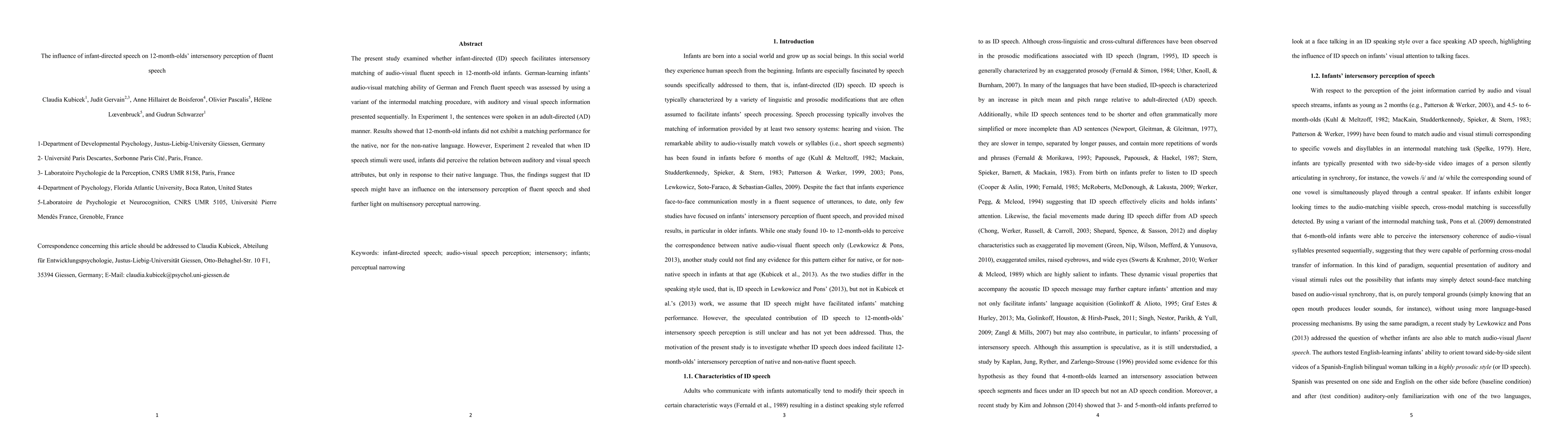 The present study examined whether infant-directed (ID) speech facilitates intersensory matching of audio--visual fluent speech in 12-month-old infants. German-learning infants\^a audio--visual matching ability of German and French fluent speech was assessed by using a variant of the intermodal matching procedure, with auditory and visual speech information presented sequentially. In Experiment 1, the sentences were spoken in an adult-directed (AD) manner. Results showed that 12-month-old infants did not exhibit a matching performance for the native, nor for the non-native language. However, Experiment 2 revealed that when ID speech stimuli were used, infants did perceive the relation between auditory and visual speech attributes, but only in response to their native language. Thus, the findings suggest that ID speech might have an influence on the intersensory perception of fluent speech and shed further light on multisensory perceptual narrowing.