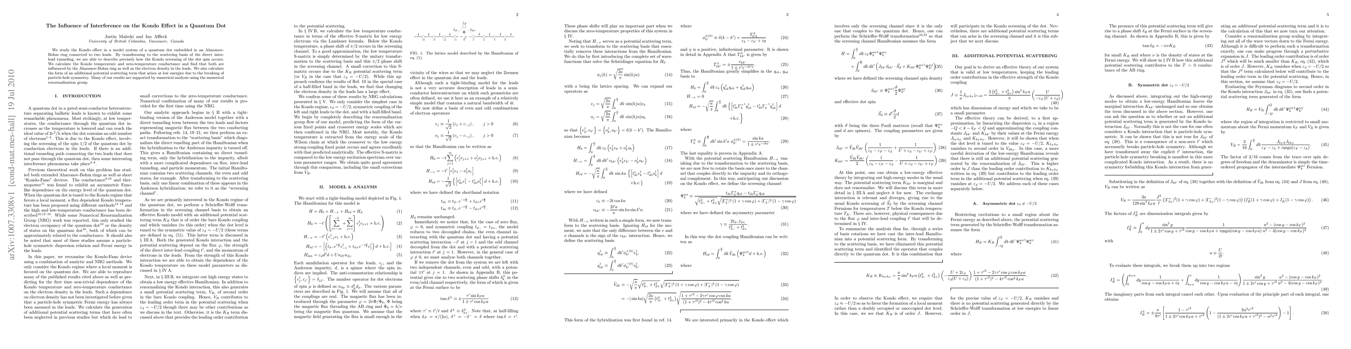 This paper investigates the Kondo effect in a quantum dot within an Aharonov-Bohm ring, revealing how interference affects Kondo screening, temperature, and conductance. The study employs scattering basis transformations and numerical renormalization group methods to support the findings.