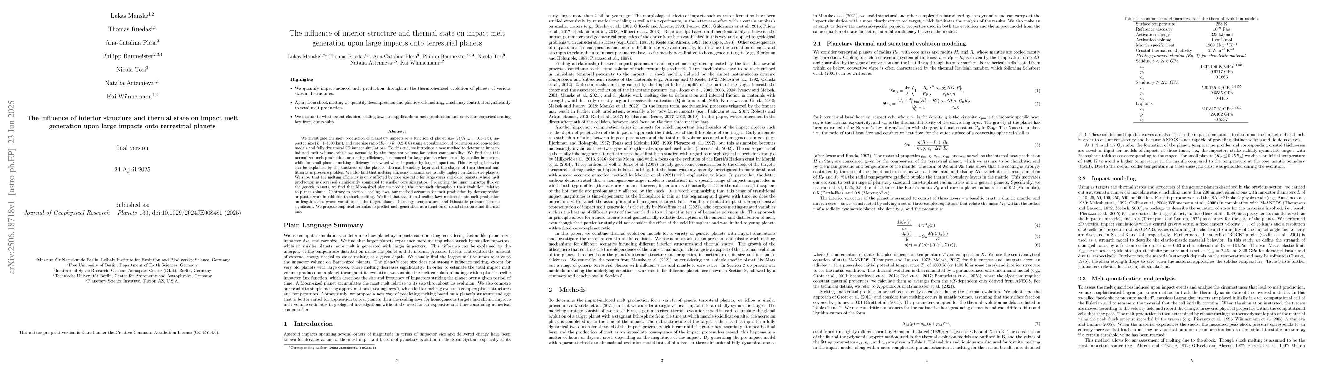We investigate the melt production of planetary impacts as a function of planet size ($R/R_\mathrm{Earth}$=0.1-1.5), impactor size ($L$=1-1000 km), and core size ratio ($R_\mathrm{core}/R$=0.2-0.8) using a combination of parameterized convection models and fully dynamical 2D impact simulations. To this end, we introduce a new method to determine impact-induced melt volumes which we normalize by the impactor volume for better comparability. We find that this normalized melt production, or melting efficiency, is enhanced for large planets when struck by smaller impactors, while for small planets, melting efficiency is elevated when impacted by larger impactors. This diverging behavior can be explained by the thickness of the planets' thermal boundary layer and the shapes of their thermal and lithostatic pressure profiles. We also find that melting efficiency maxima are usually highest on Earth-size planets. We show that the melting efficiency is only affected by core size ratio for large cores and older planets, where melt production is decreased significantly compared to smaller core size ratios. Projecting the lunar impactor flux on the generic planets, we find that Moon-sized planets produce the most melt throughout their evolution, relative to planet volume. Contrary to previous scaling laws, our method accounts for melt production by decompression or plastic work in addition to shock melting. We find that traditional scaling laws underestimate melt production on length scales where variations in the target planets' lithology, temperature, and lithostatic pressure become significant. We propose empirical formulas to predict melt generation as a function of radial structure and thermal age.