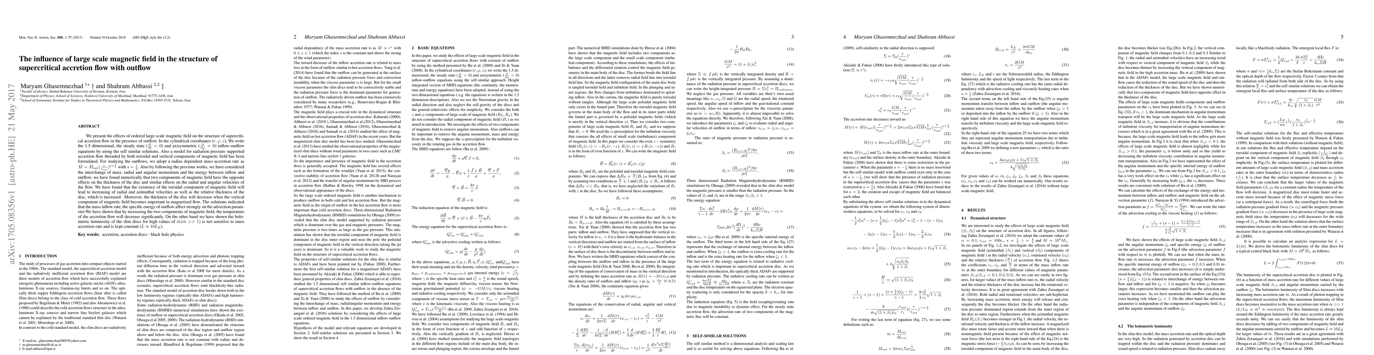 This paper investigates the impact of large-scale magnetic fields on supercritical accretion flow with outflow, finding that toroidal fields increase radial and azimuthal velocities and disc thickness, while vertical fields decrease disc thickness. The study concludes that magnetic fields significantly reduce accretion flow temperature and that high mass accretion rates do not affect bolometric luminosity.