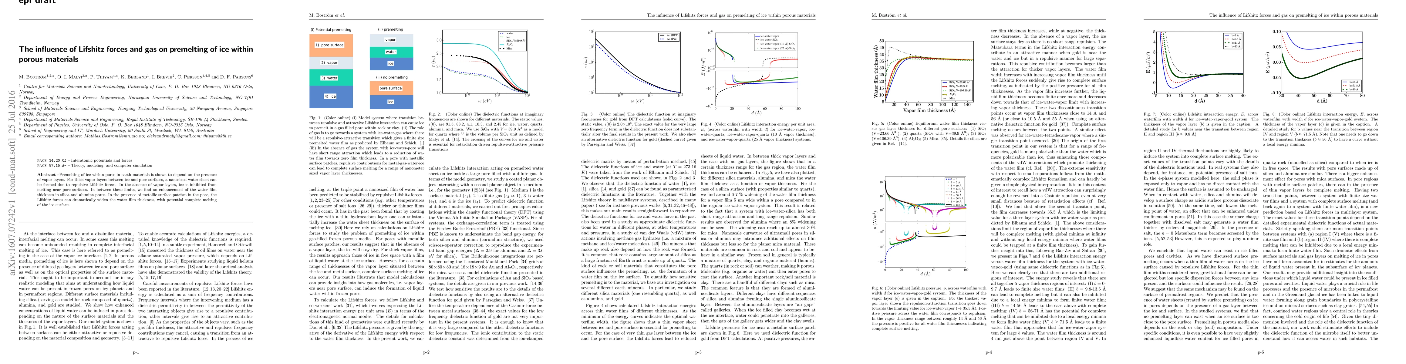 Summary: The study reveals that premelting of ice in porous materials is influenced by vapor layers and Lifshitz forces, leading to the formation of a nanosized water sheet in the presence of thick vapor layers. Metallic surface patches can significantly enhance water film thickness, potentially causing complete ice surface melting.