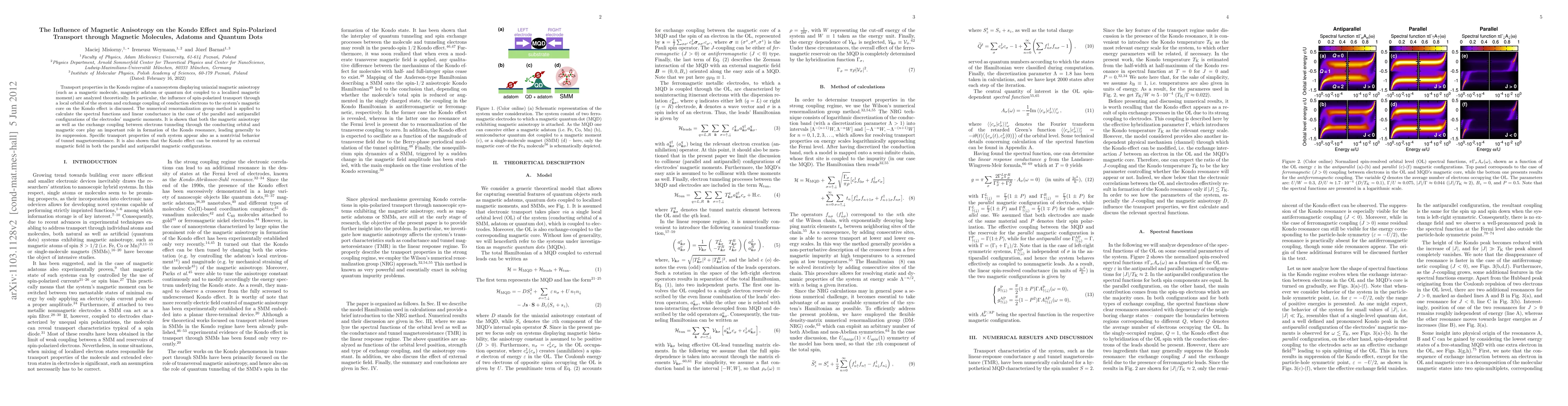 This paper investigates the influence of magnetic anisotropy on the Kondo effect and spin-polarized transport in magnetic nanosystems, revealing that both anisotropy and exchange coupling significantly suppress the Kondo resonance, while an external magnetic field can restore the effect. The study uses numerical renormalization group methods to analyze spectral functions and conductance.
