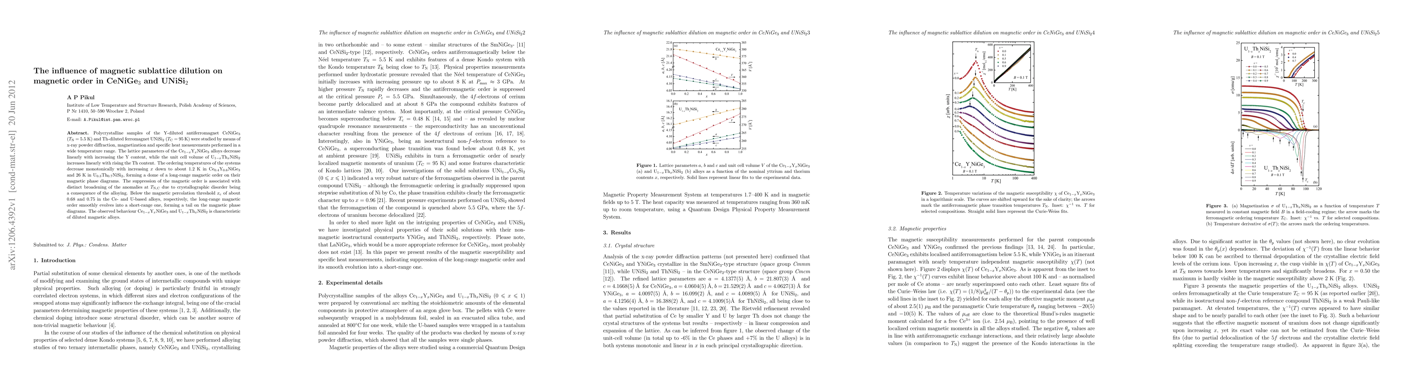 Polycrystalline samples of the Y-diluted antiferromagnet CeNiGe3 (T_N = 5.5 K) and Th-diluted ferromagnet UNiSi2 (T_C = 95 K) were studied by means of x-ray powder diffraction, magnetization and specific heat measurements performed in a wide temperature range. The lattice parameters of the Ce1-xYxNiGe3 alloys decrease linearly with increasing the Y content, while the unit cell volume of U1-xThxNiSi2 increases linearly with rising the Th content. The ordering temperatures of the systems decrease monotonically with increasing x down to about 1.2 K in Ce0.4Y0.6NiGe3 and 26 K in U0.3Th0.7NiSi2, forming a dome of a long-range magnetic order on their magnetic phase diagrams. The suppression of the magnetic order is associated with distinct broadening of the anomalies at T_N,C due to crystallographic disorder being a consequence of the alloying. Below the magnetic percolation threshold xc of about 0.68 and 0.75 in the Ce- and U-based alloys, respectively, the long-range magnetic order smoothly evolves into a short-range one, forming a tail on the magnetic phase diagrams. The observed behaviour Ce1-xYxNiGe3 and U1-xThxNiSi2 is characteristic of diluted magnetic alloys. (c) 2012 IOP Publishing Ltd.