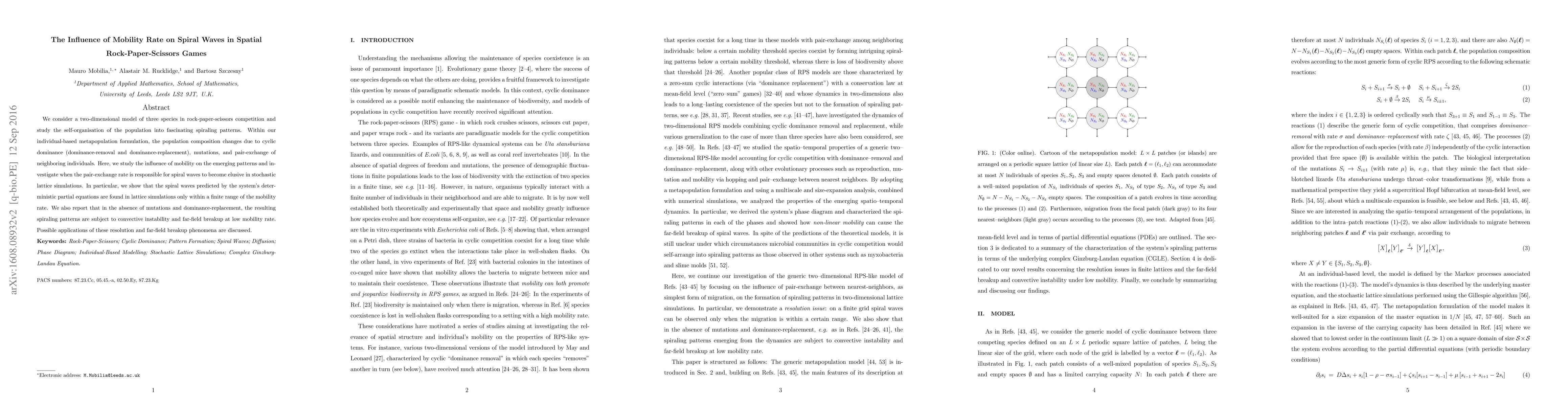 This paper investigates the impact of mobility on spiral wave patterns in a two-dimensional rock-paper-scissors competition model, finding that spiral waves only emerge within a specific range of mobility rates. It also highlights that low mobility rates lead to convective instability without mutations and dominance-replacement.