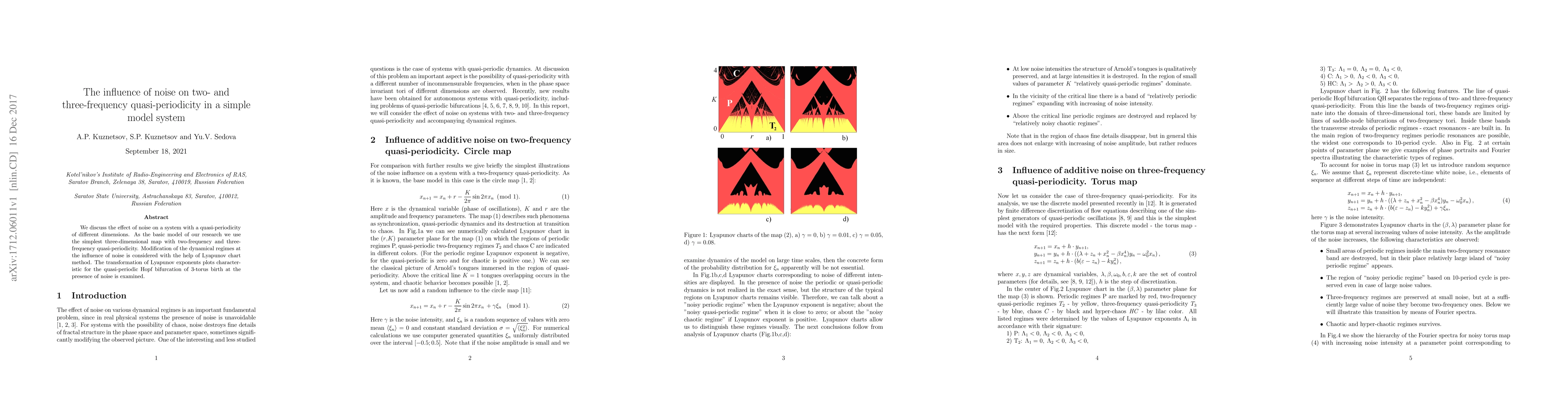 This paper investigates how noise affects a simple three-dimensional map with two- and three-frequency quasi-periodicity, using the Lyapunov chart method to study the resulting dynamical regime changes and the transformation of Lyapunov exponents in the presence of noise.