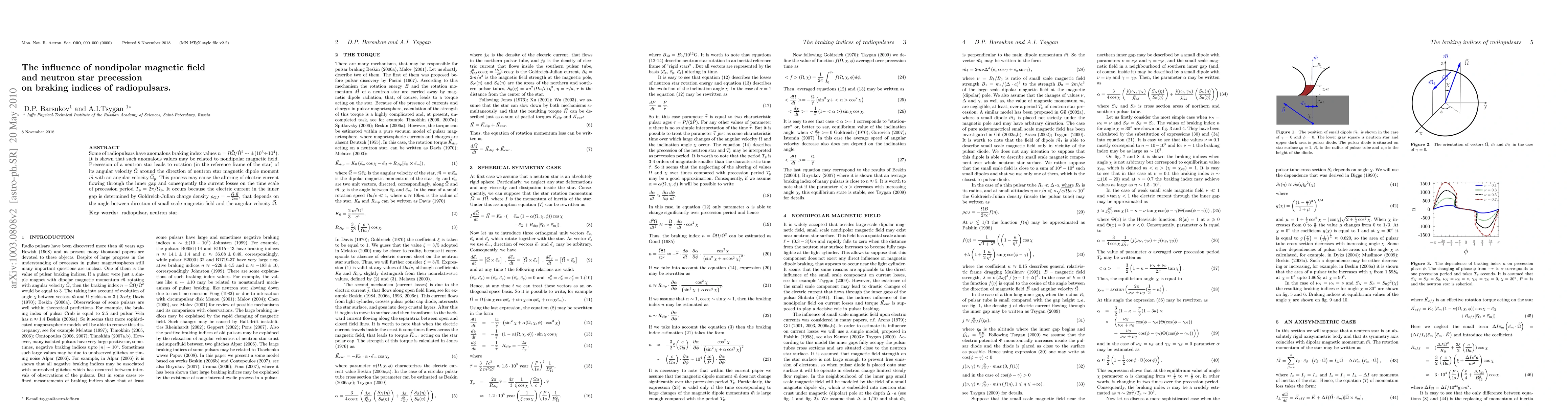 This paper investigates how nondipolar magnetic fields and neutron star precession affect the braking indices of radiopulsars, revealing anomalous braking indices may stem from such magnetic configurations. The precession alters electric current flow in inner gaps, influencing current losses on the same timescale as the precession period, due to the dependence of Goldreich-Julian charge density on the angle between the magnetic field and angular velocity.