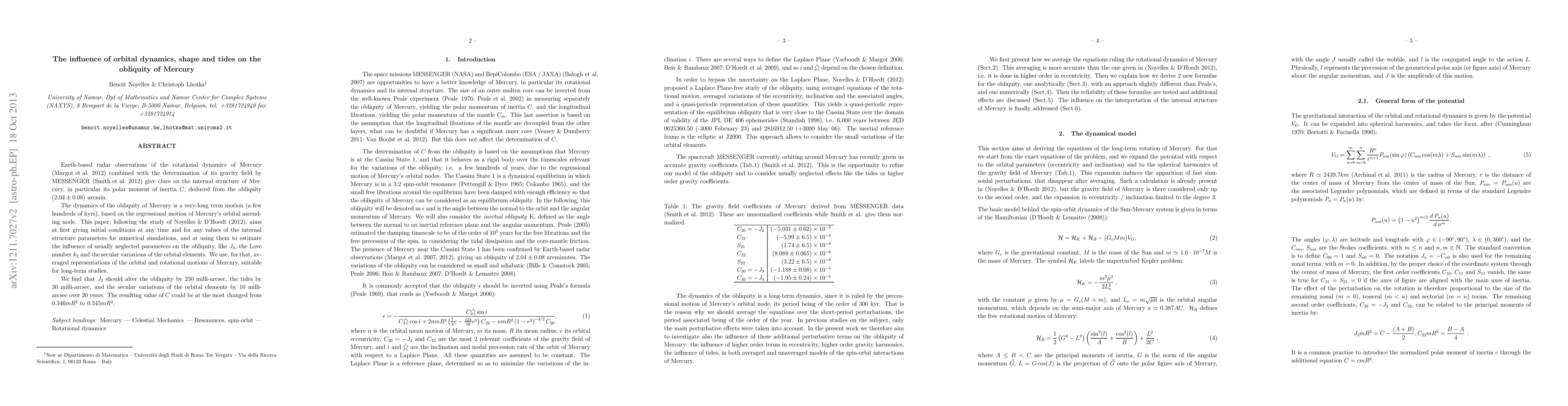 This paper investigates the long-term dynamics of Mercury's obliquity, focusing on the influences of orbital dynamics, shape, and tides. It finds that parameters like J3, tidal effects, and orbital element variations can alter Mercury's obliquity by up to 250 milli-arcsec over 20 years, slightly affecting the polar moment of inertia C.