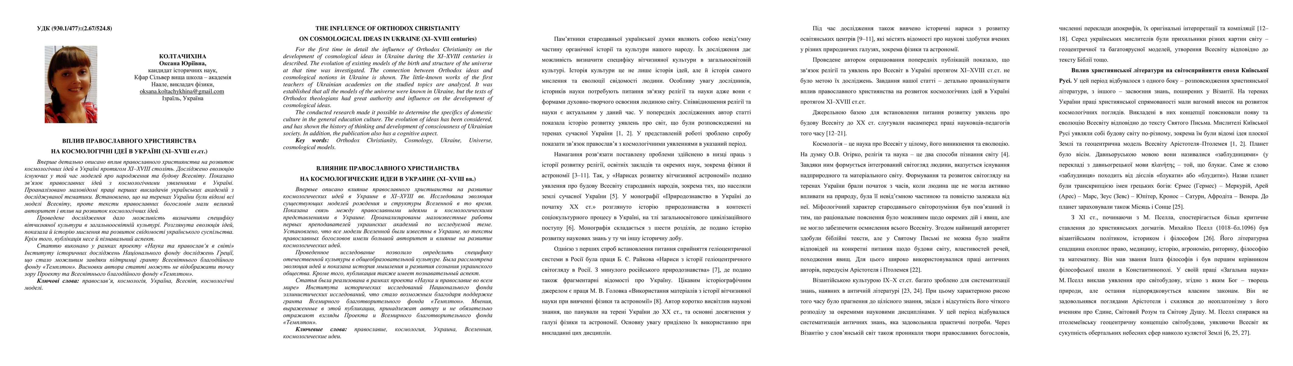 The paper presents a comprehensive analysis of the interplay between religious texts and cosmological models, providing insights into the unique blend of Orthodox Christianity and ancient Greek philosophies in shaping Ukrainian cosmological ideas.