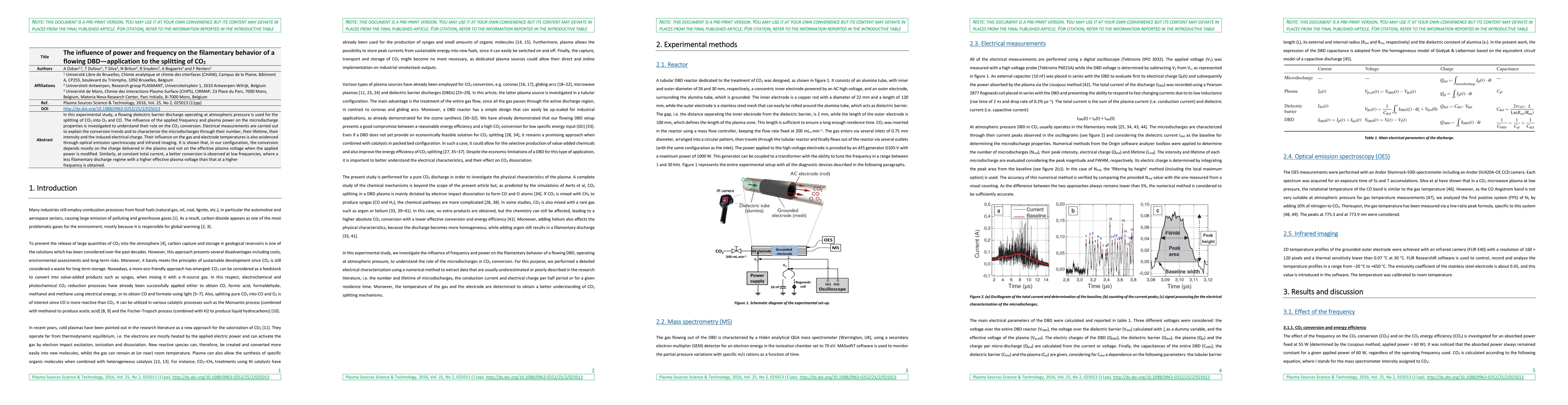 Research investigates how plasma power and frequency affect CO2 splitting into O2 and CO in a flowing DBD application, finding that charge delivery and low-frequency conditions lead to better conversion.