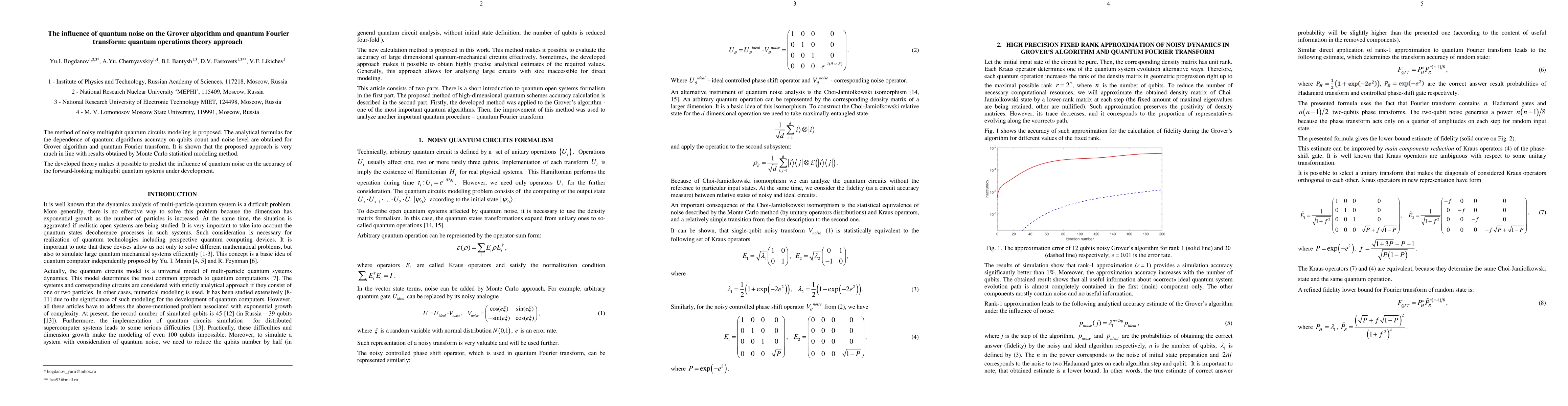This paper proposes a theoretical method for modeling quantum noise in multiqubit circuits, deriving analytical formulas to predict the accuracy of Grover algorithm and quantum Fourier transform based on qubit count and noise levels. The results align closely with Monte Carlo statistical modeling, offering a predictive tool for quantum noise impact in advanced quantum systems.
