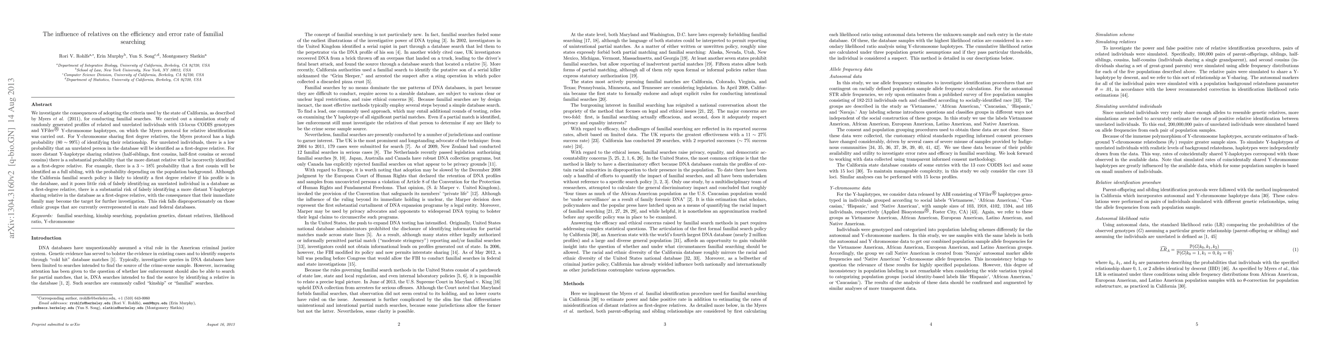 This research simulates the impact of California's familial search criteria on identifying relatives in DNA databases using 13-locus CODIS genotypes and YFiler Y-chromosome haplotypes. It finds high accuracy for first-degree relatives but significant false positives for more distant relatives, especially first cousins, disproportionately affecting overrepresented ethnic groups.