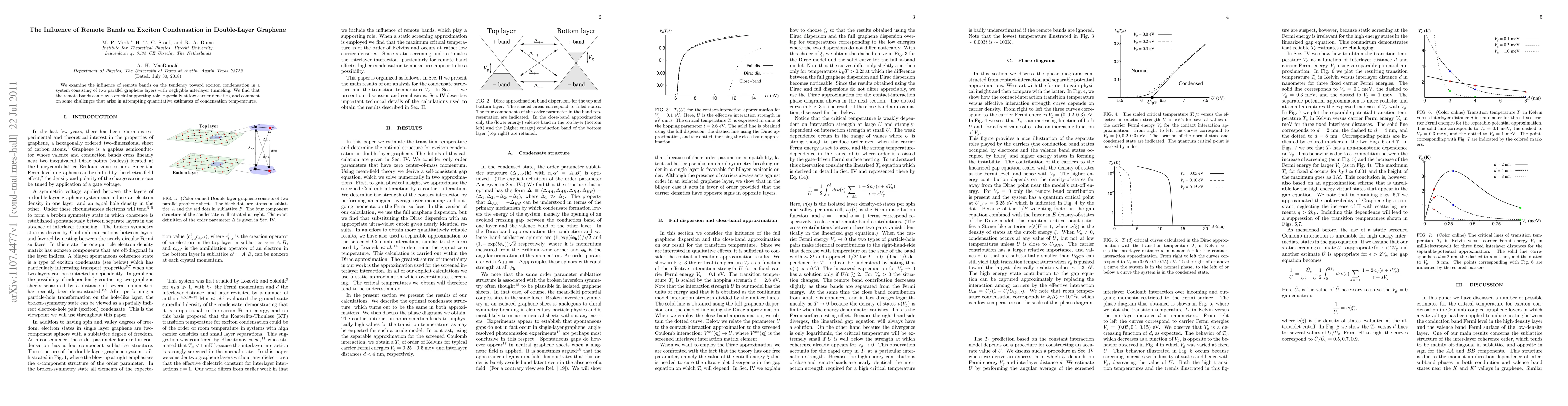 Summary: This study investigates how remote bands affect exciton condensation in double-layer graphene with minimal interlayer tunneling. It reveals that remote bands significantly support exciton condensation, particularly at low carrier densities, while also noting challenges in accurately estimating condensation temperatures.