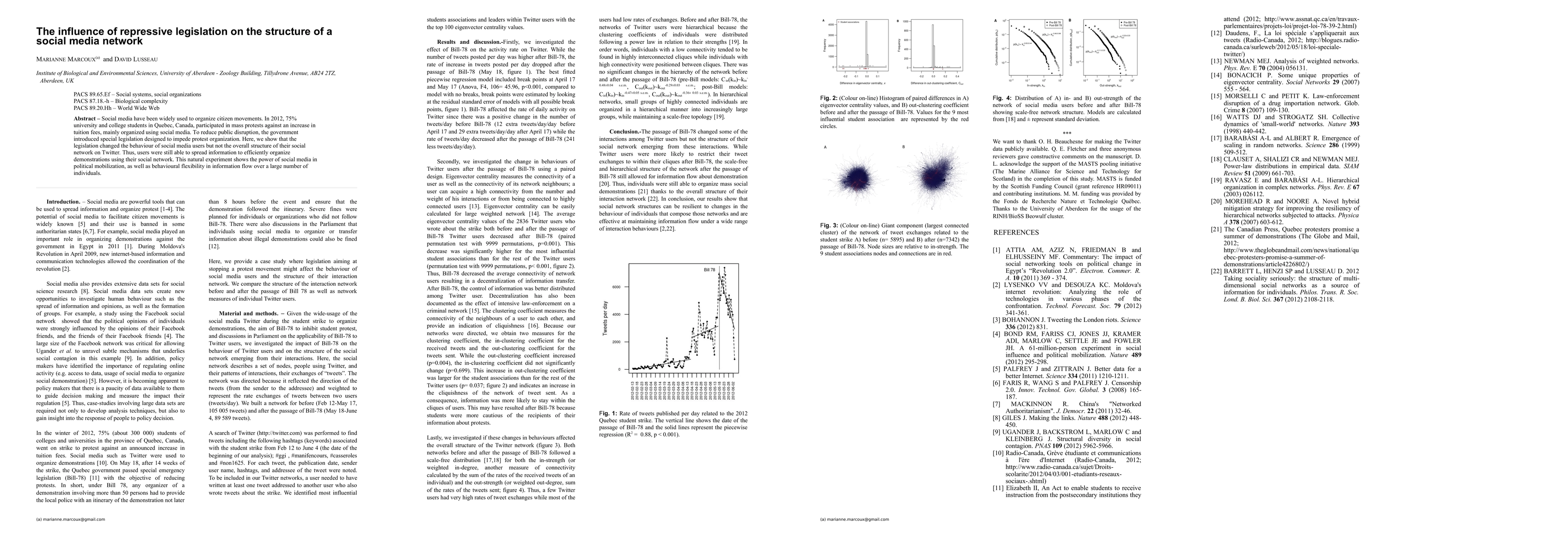 Social media have been widely used to organize citizen movements. In 2012, 75% university and college students in Quebec, Canada, participated in mass protests against an increase in tuition fees, mainly organized using social media. To reduce public disruption, the government introduced special legislation designed to impede protest organization. Here, we show that the legislation changed the behaviour of social media users but not the overall structure of their social network on Twitter. Thus, users were still able to spread information to efficiently organize demonstrations using their social network. This natural experiment shows the power of social media in political mobilization, as well as behavioural flexibility in information flow over a large number of individuals.