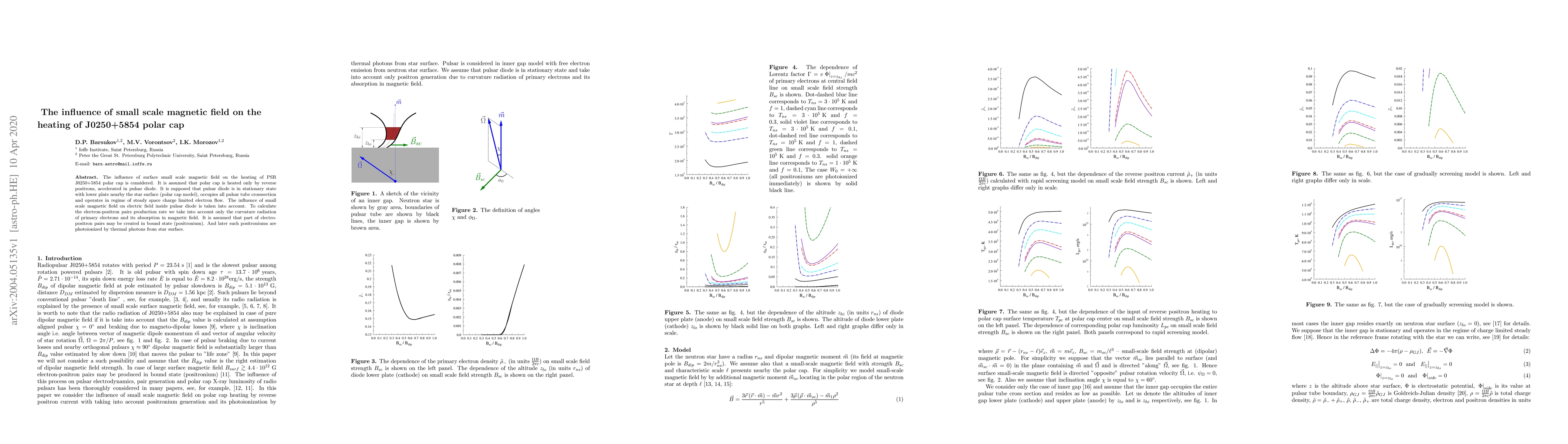 The study investigates the influence of small-scale magnetic fields on the heating of J0250+5854's polar cap, assuming the polar cap is heated by reverse positrons accelerated in the pulsar diode. The model considers a stationary state of the pulsar diode near the star's surface, occupying the entire pulsar tube cross-section and operating in the regime of steady space charge limited electron flow. The impact of small-scale magnetic fields on the electric field inside the pulsar diode is taken into account, and pair production rate calculations include curvature radiation of primary electrons and their absorption in the magnetic field, with consideration for positronium creation and photoionization by thermal photons from the star's surface.