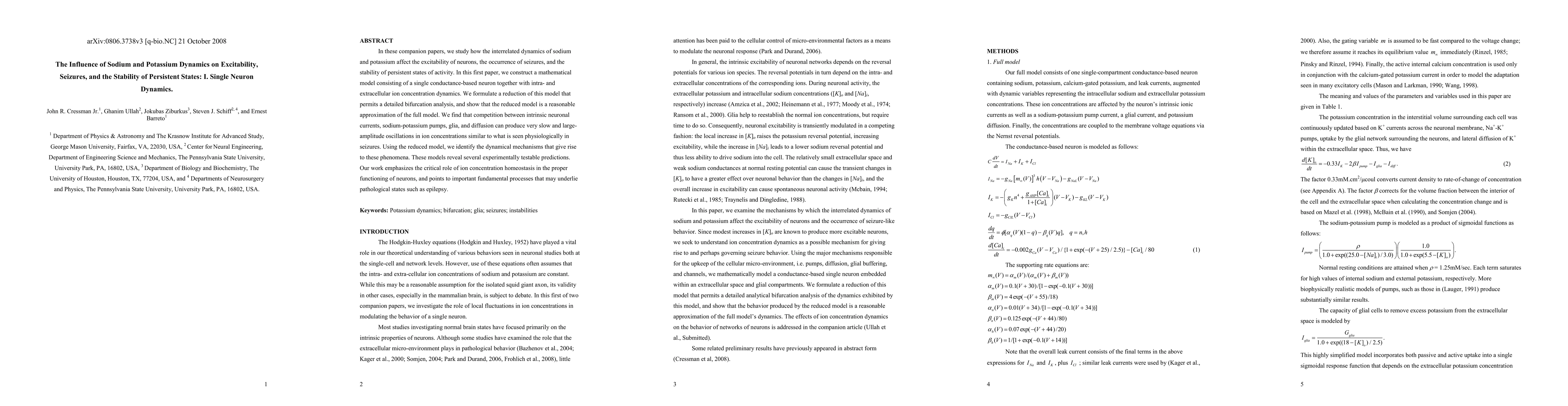 In these companion papers, we study how the interrelated dynamics of sodium and potassium affect the excitability of neurons, the occurrence of seizures, and the stability of persistent states of activity. In this first paper, we construct a mathematical model consisting of a single conductance-based neuron together with intra- and extracellular ion concentration dynamics. We formulate a reduction of this model that permits a detailed bifurcation analysis, and show that the reduced model is a reasonable approximation of the full model. We find that competition between intrinsic neuronal currents, sodium-potassium pumps, glia, and diffusion can produce very slow and large-amplitude oscillations in ion concentrations similar to what is seen physiologically in seizures. Using the reduced model, we identify the dynamical mechanisms that give rise to these phenomena. These models reveal several experimentally testable predictions. Our work emphasizes the critical role of ion concentration homeostasis in the proper functioning of neurons, and points to important fundamental processes that may underlie pathological states such as epilepsy.